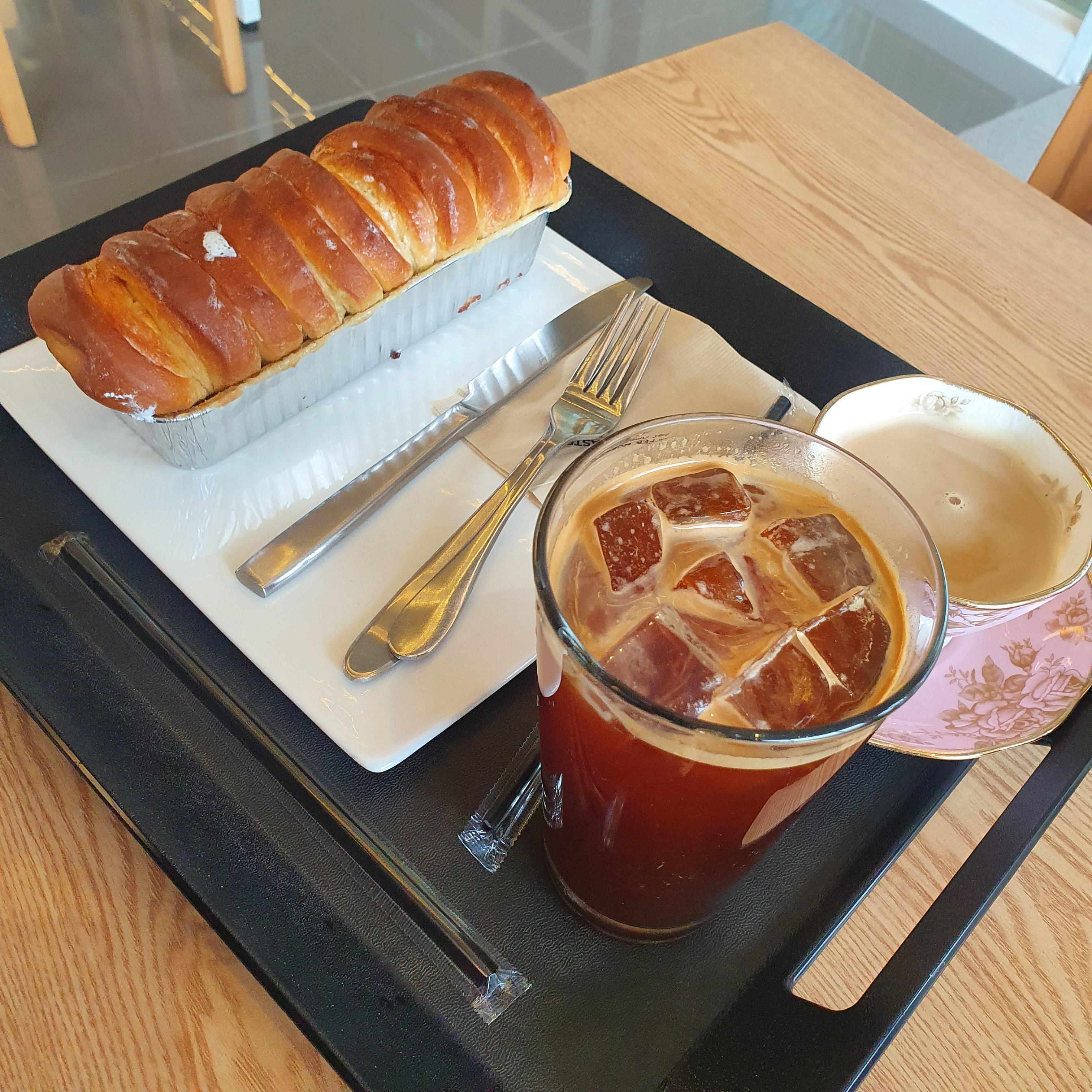 저희는 아이스 아메리카노와 로열 밀크티, 연유 브레드를 주문했습니다.