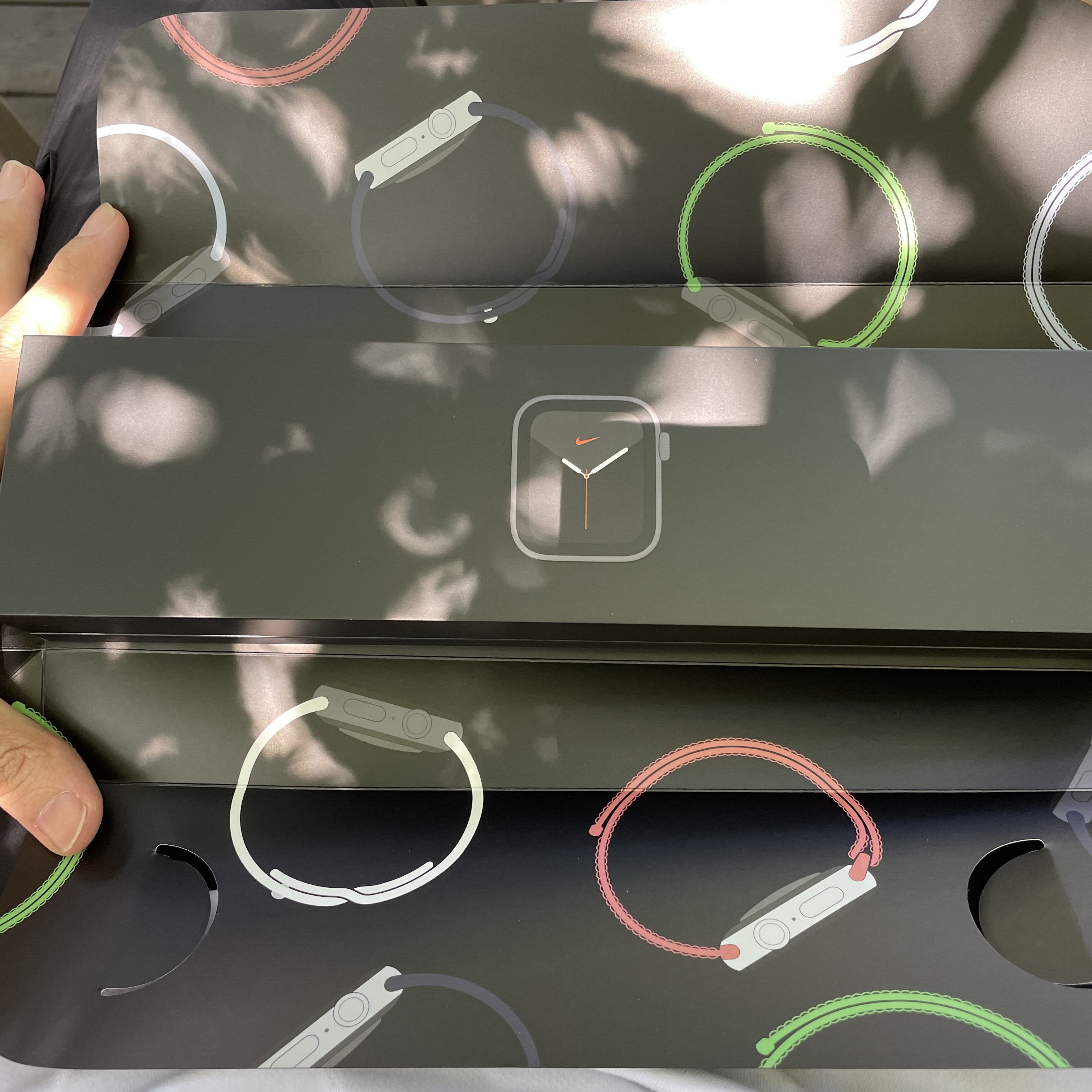 박스를 개봉하면 빙글빙글 애플워치들로 장식이 되어 있고 중간에 2개의 박스로 구성되어 있어요.