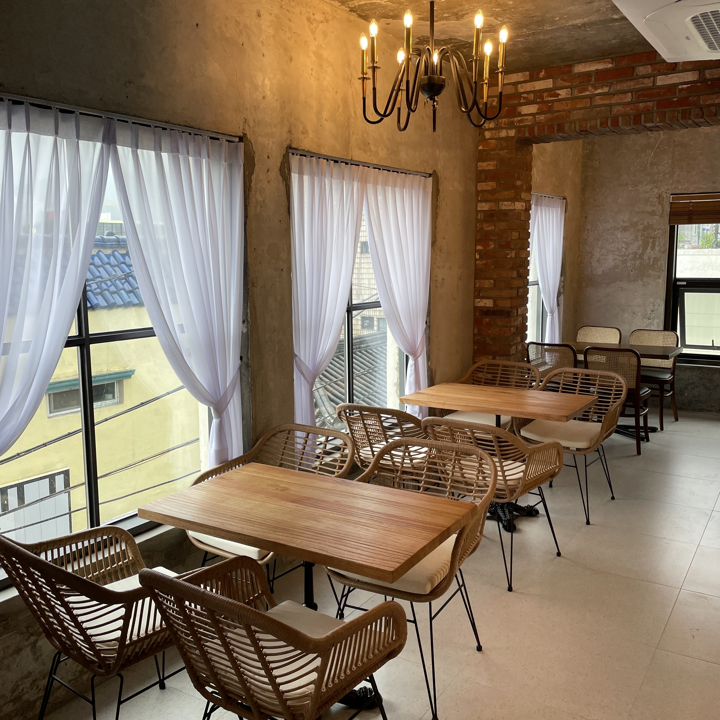창의 커튼은 하얀색으로 되어 있고 조명은 앤티크 한 조명으로 분위기가 한껏 좋아 보입니다.