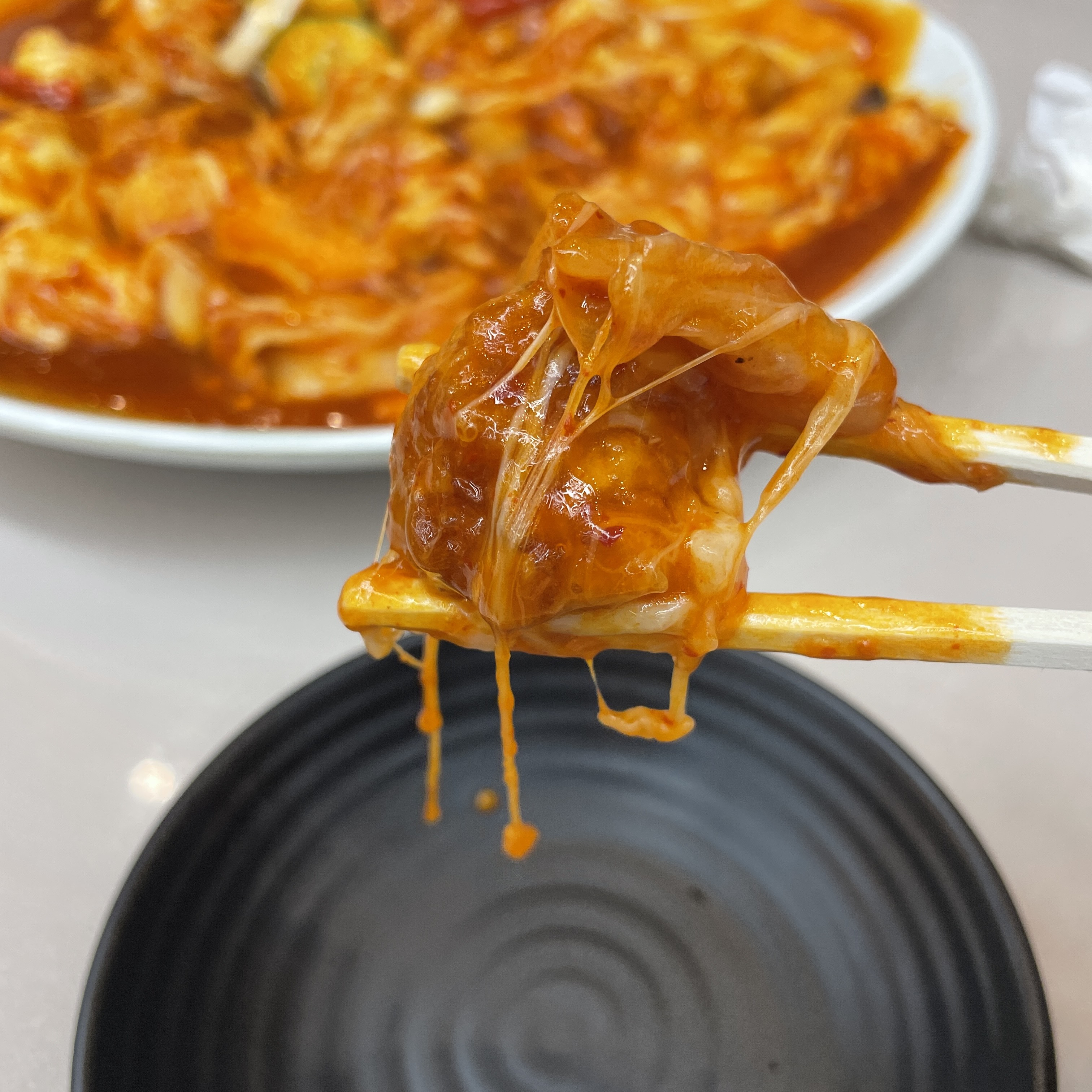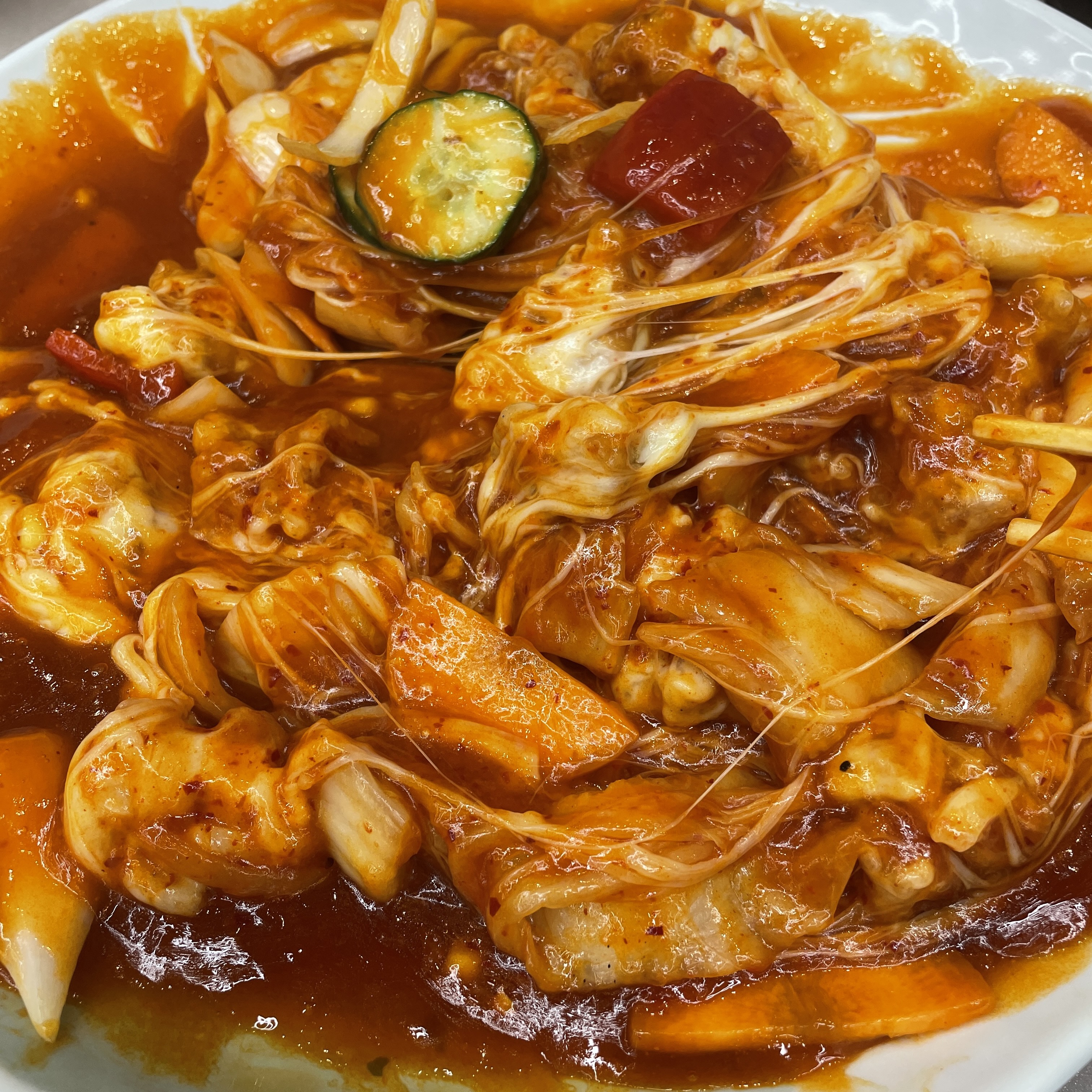 김치, 탕수육, 양파 조합.