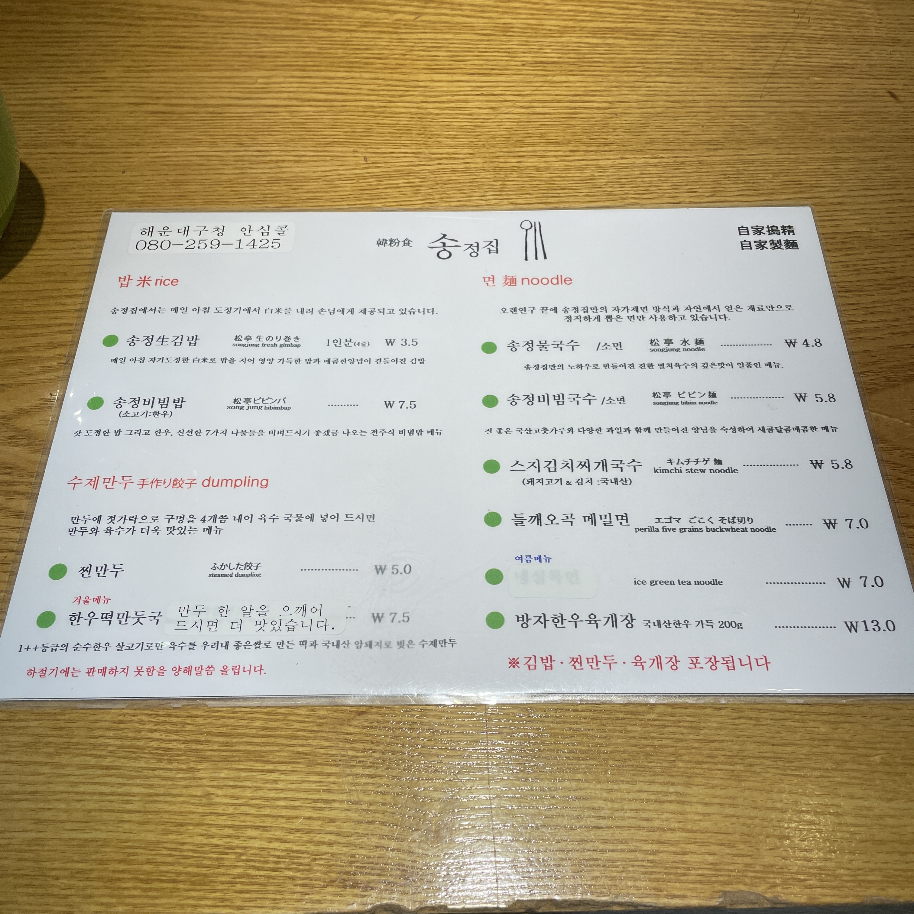 송정 생 김밥, 송정 비빔국수, 스지 김치찌개 국수, 찐만두