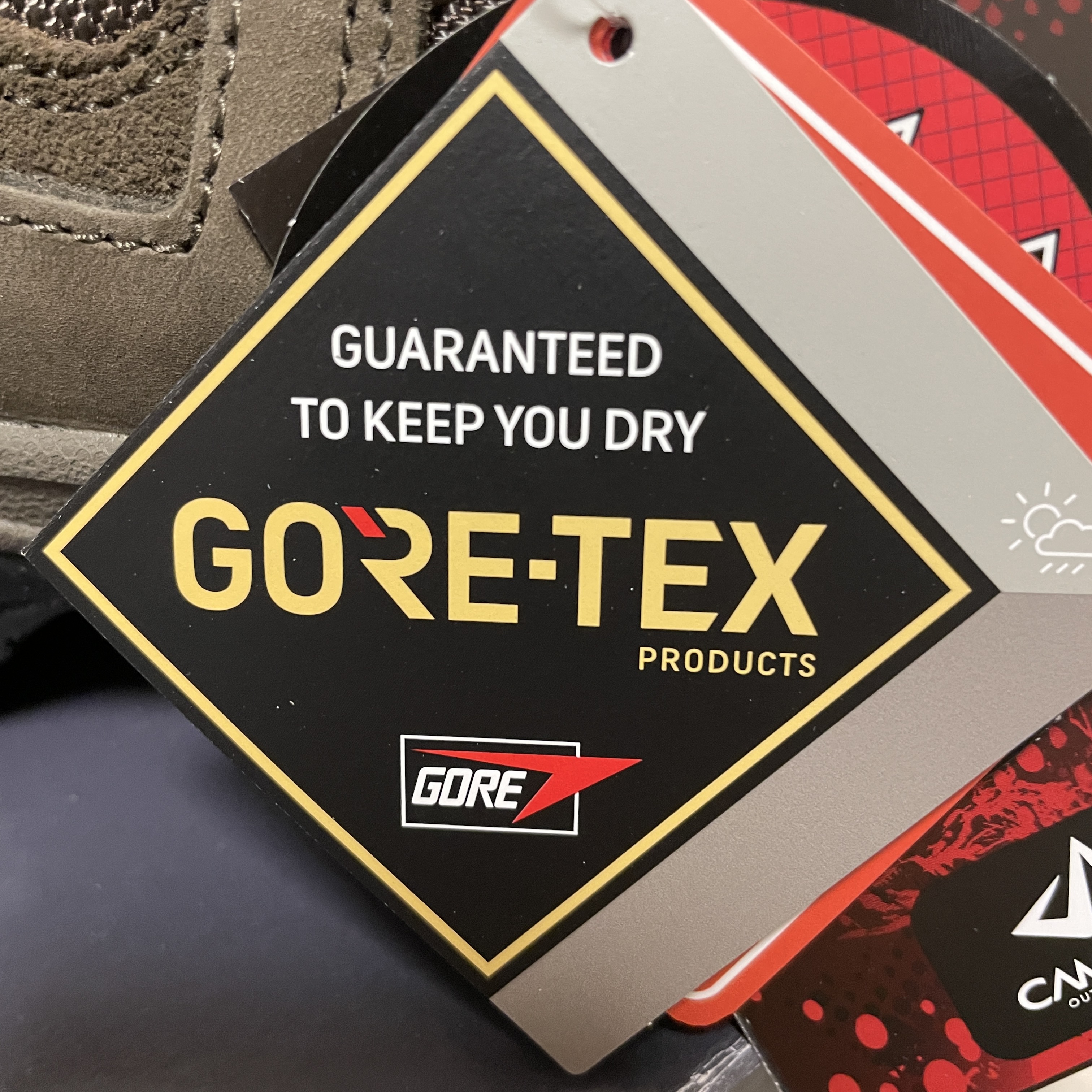 한쪽에는 등산화의 기능을 자랑하는 여러 가지의 태그들이 붙어 있어요.