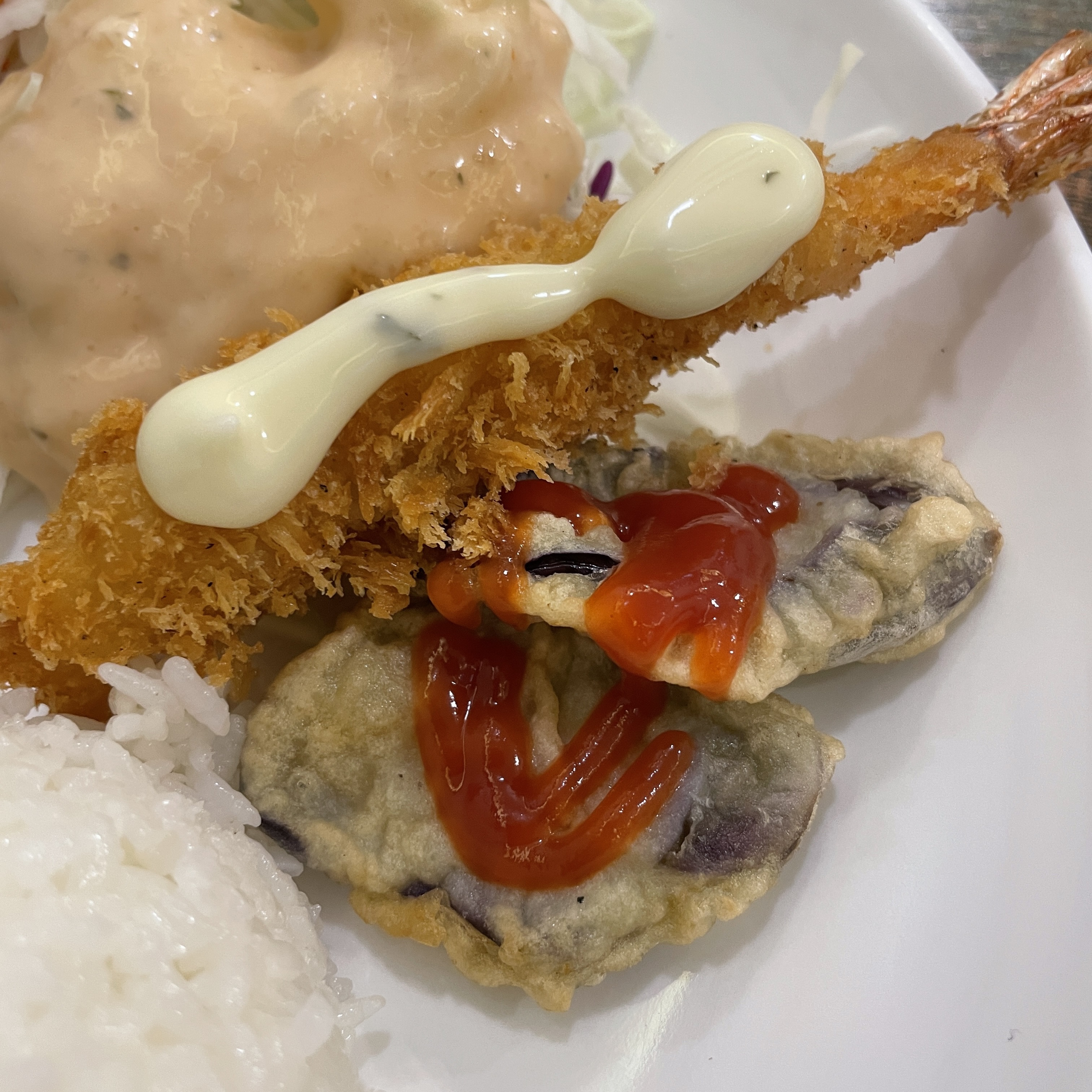 새우튀김도 하나 올라가 있고요, 저기 위쪽에 보이시는 가지 튀김은 날마다 바뀌는 스페셜 사이드라고 합니다.