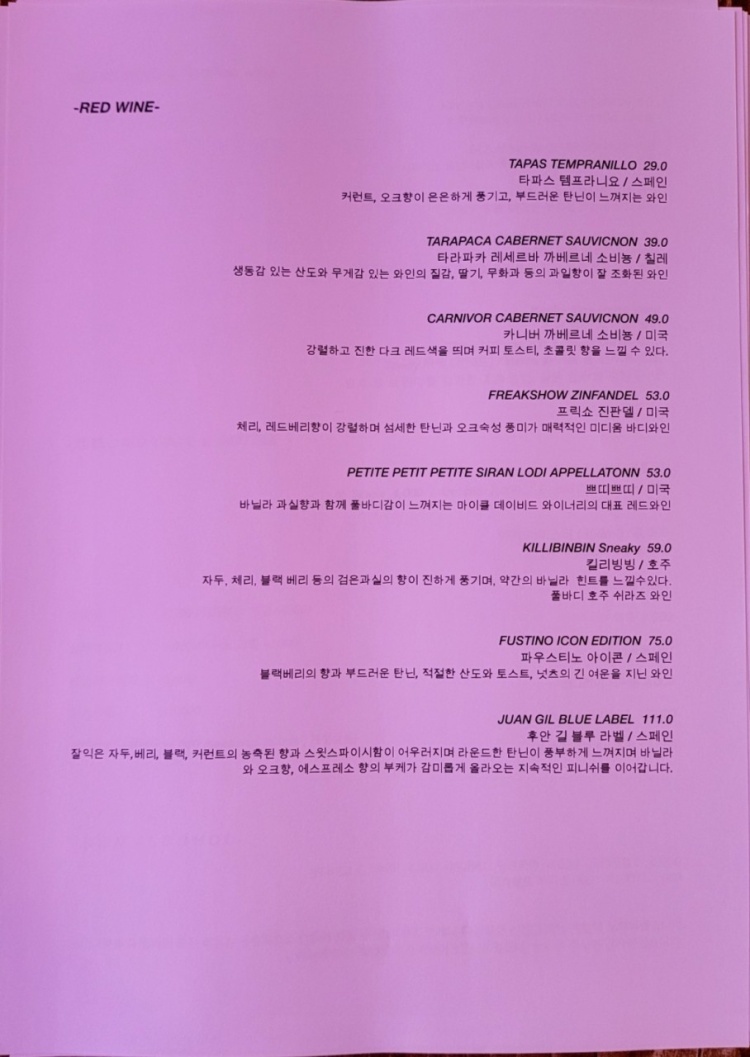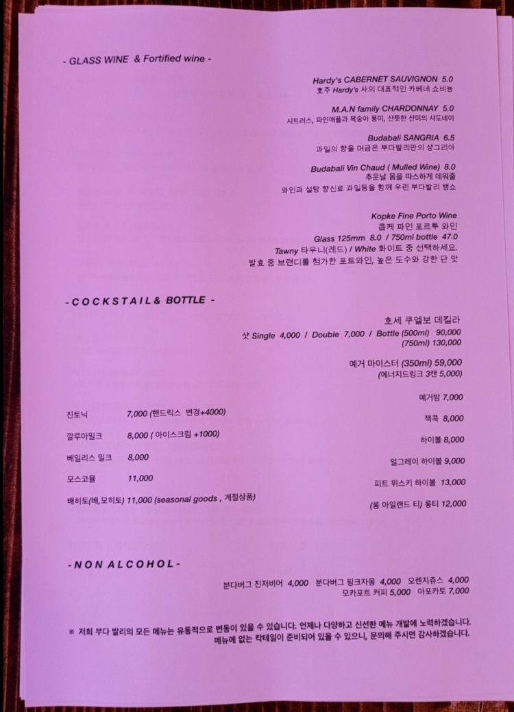 안주, 병맥, 생맥, 각종 와인, 칵테일까지 다양한 주류들이 있네요.