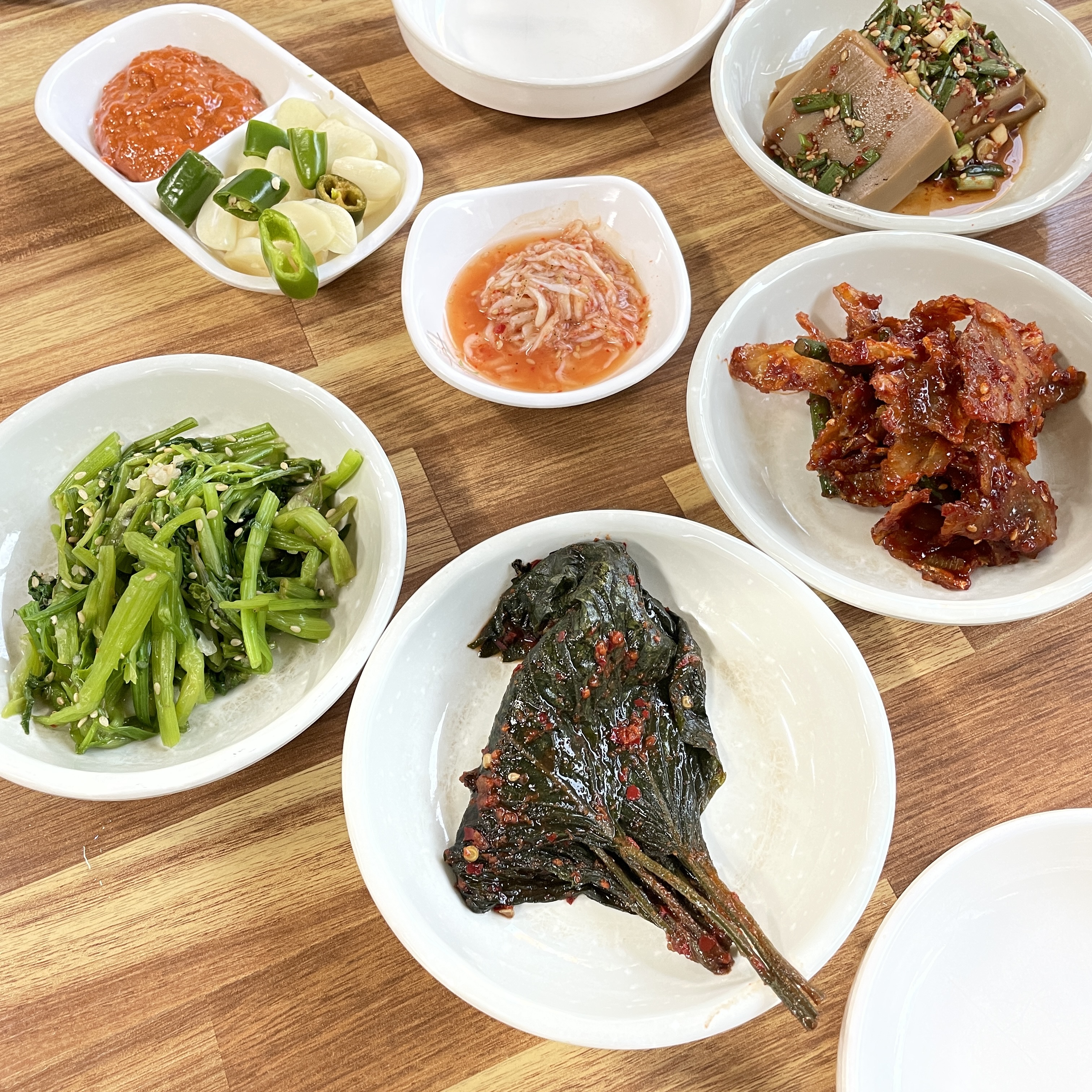 김치 어묵국, 미나리, 깻잎, 쥐포, 도토리묵, 쌈 등