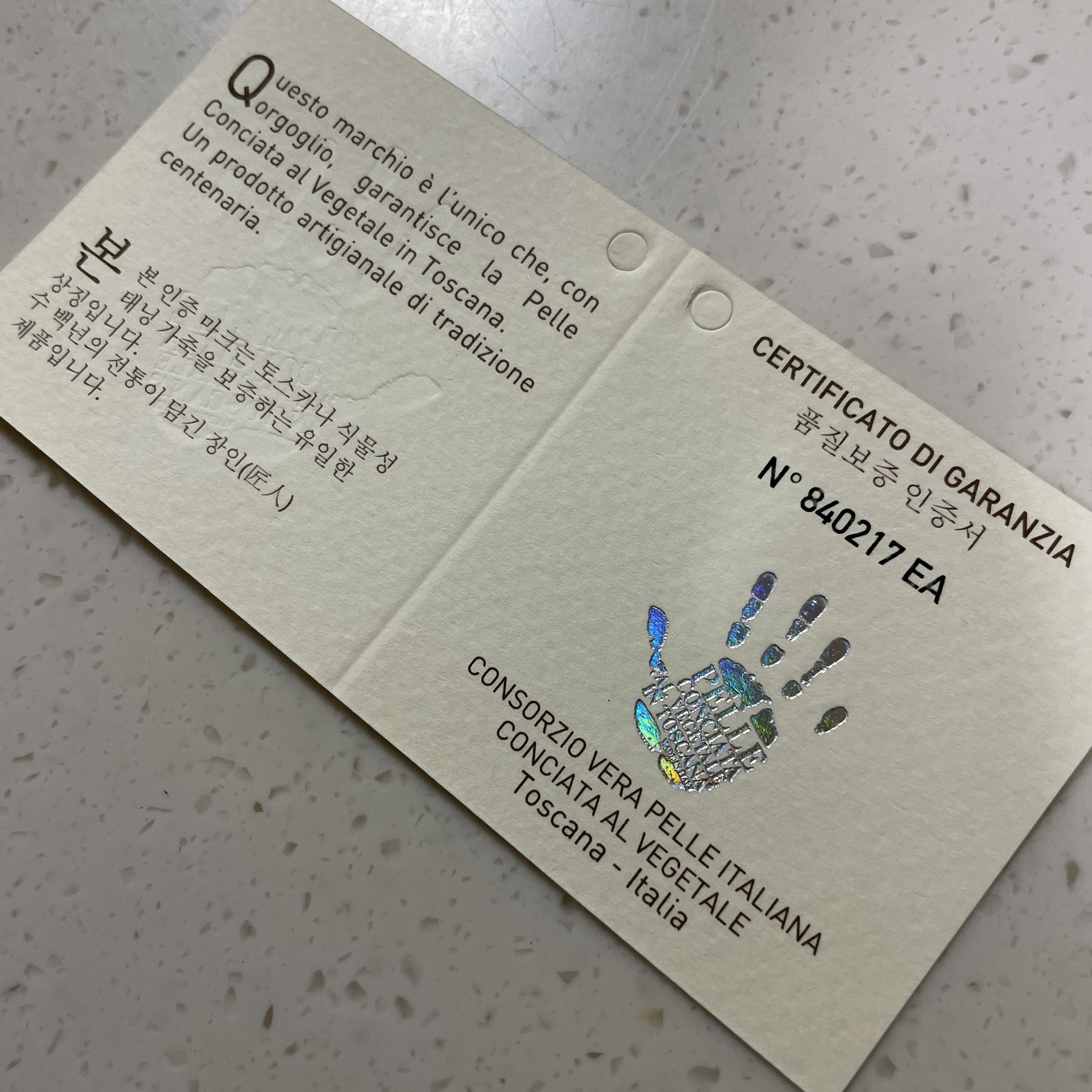 그리고 신기하게 가죽에 대한 품질보증 인증서도 있었어요.