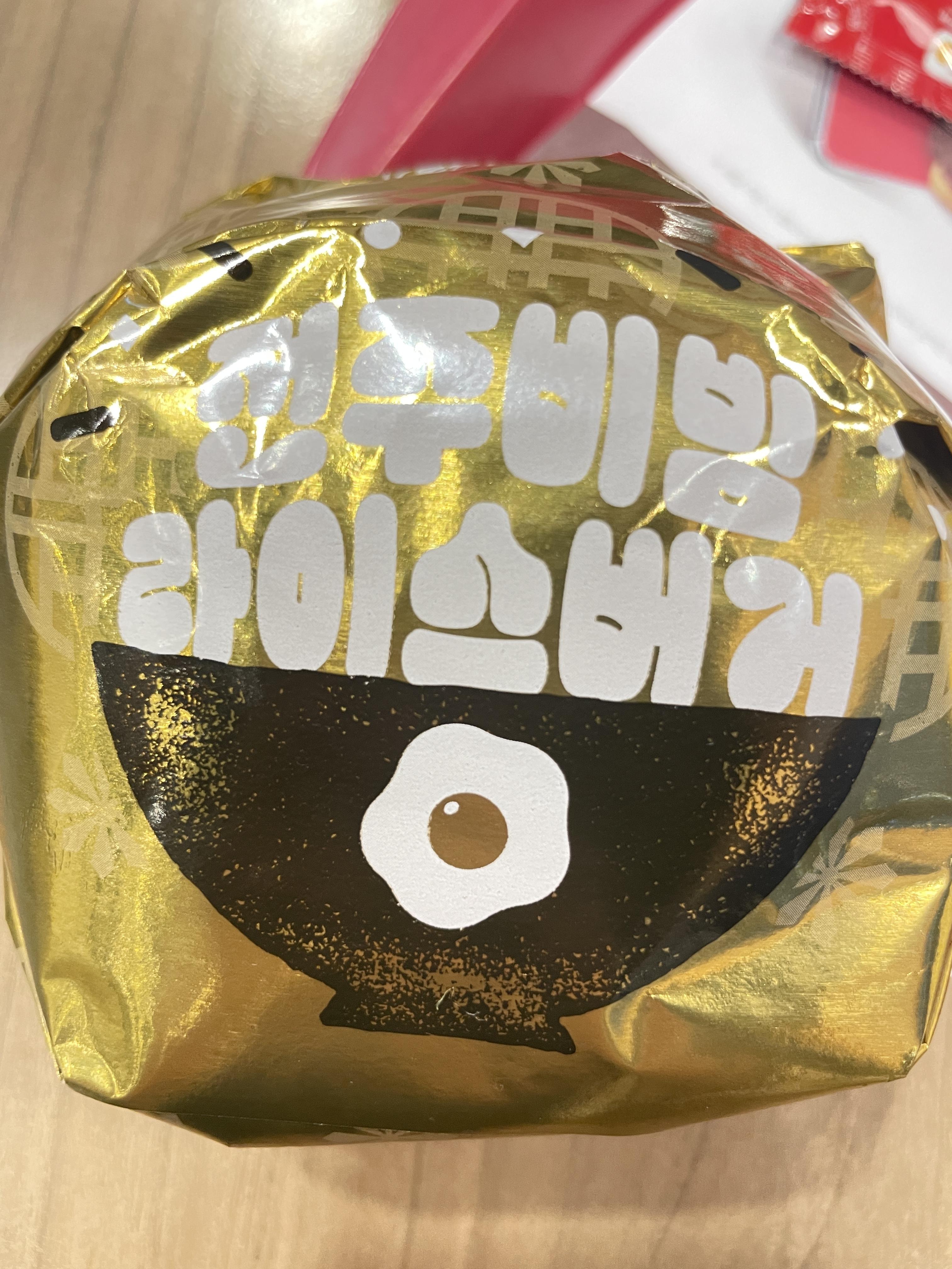 고급스러운 금색 포장지에 비빔밥이 생각나는 계란프라이, 큰 그릇이 그려져 있네요.