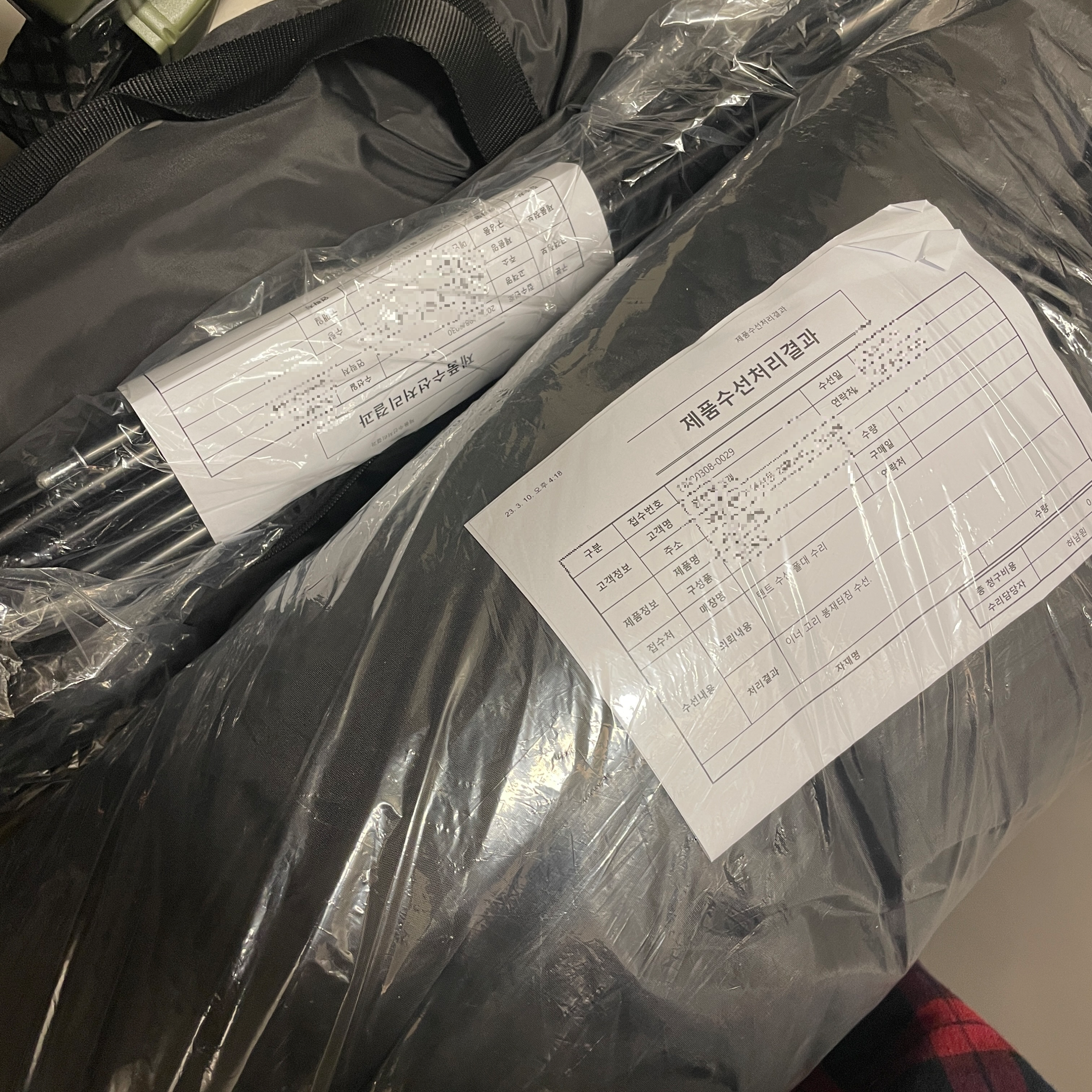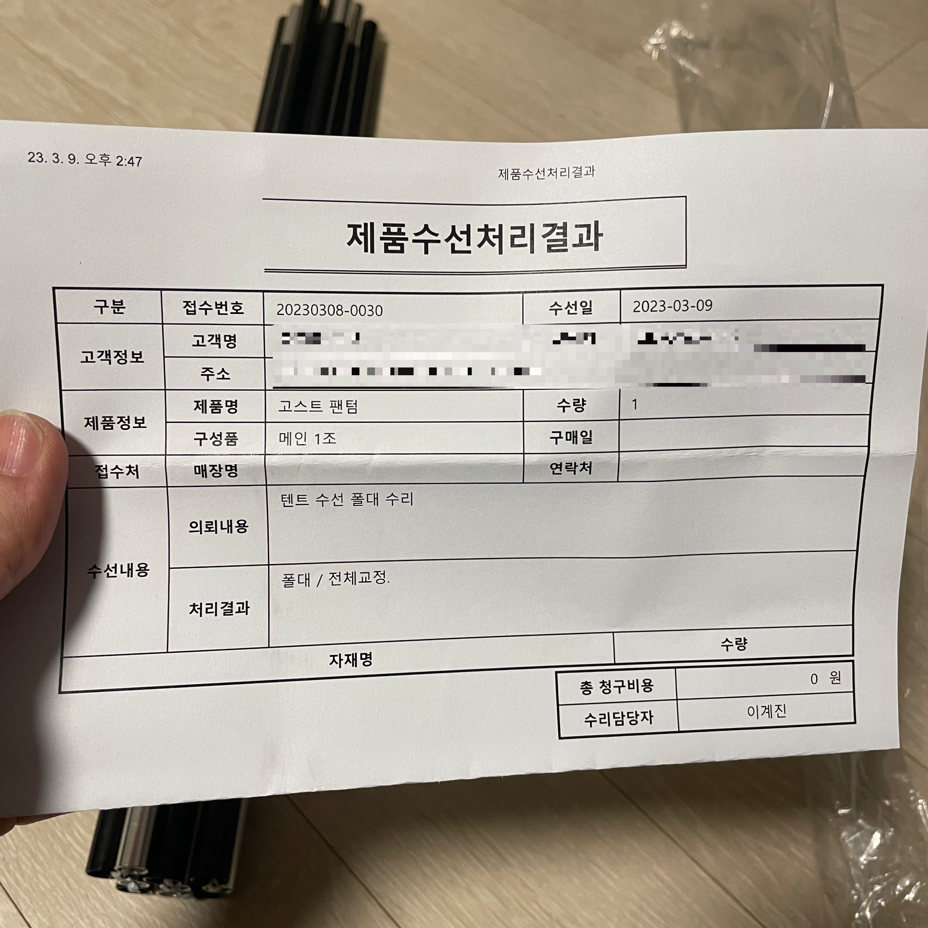 이렇게 각 수선 사항에 대해 담당자와 제품 수선 처리결과 용지가 함께 옵니다.
