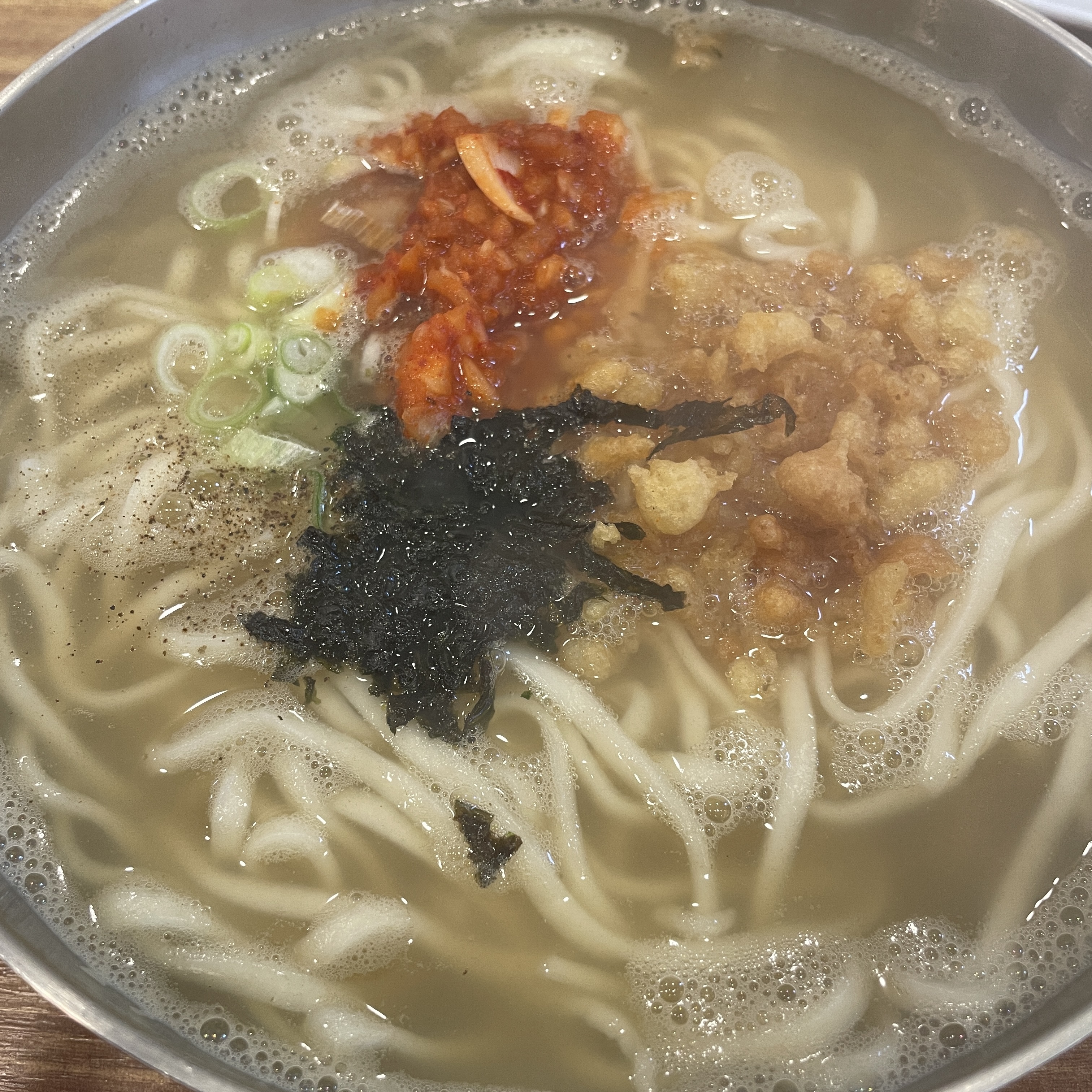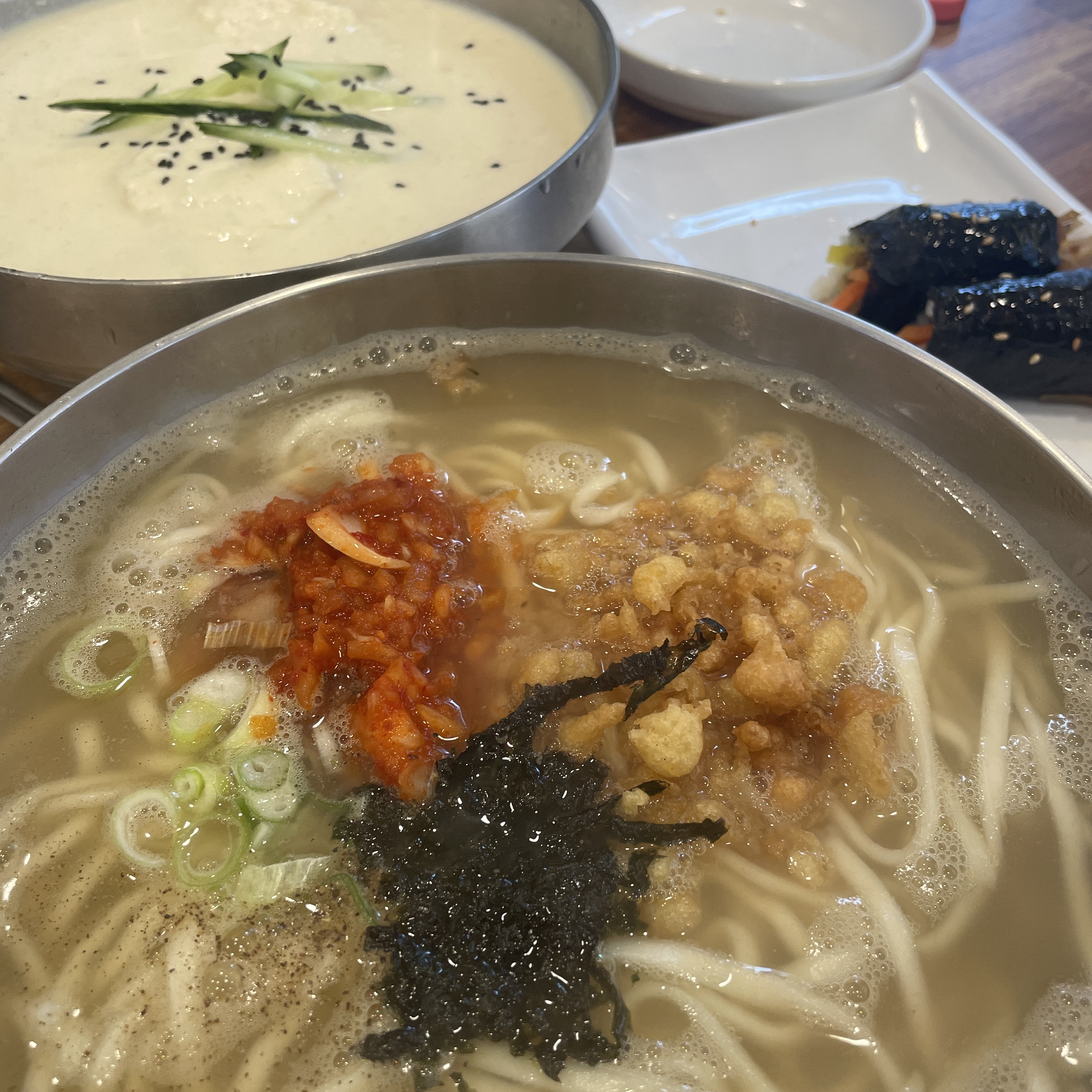 칼국수는 김치와 김가루 파 튀김가루로 데코가 되어 있네요.