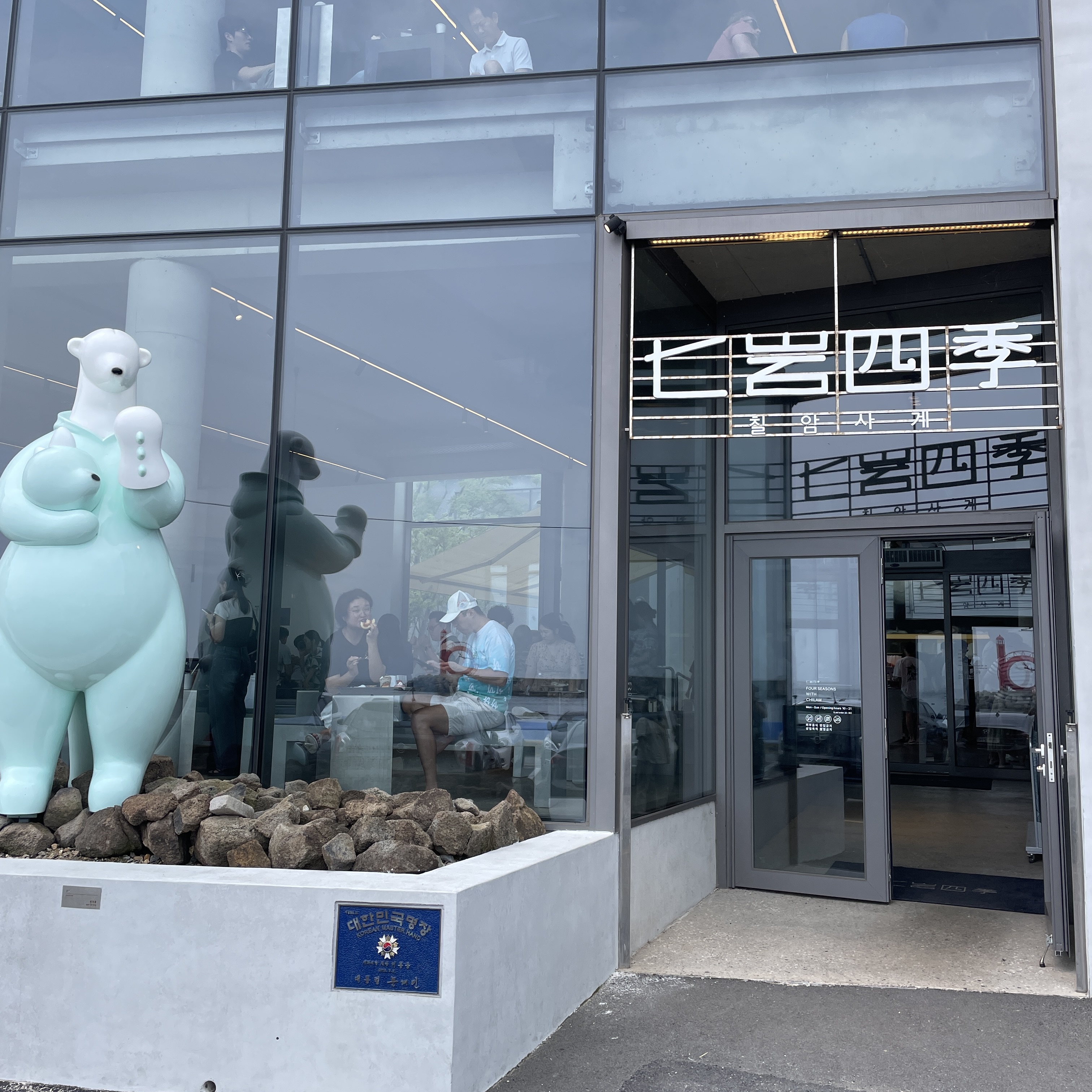 칠암사계 정문에는 곰돌이가 빵장갑을 끼고 있습니다.