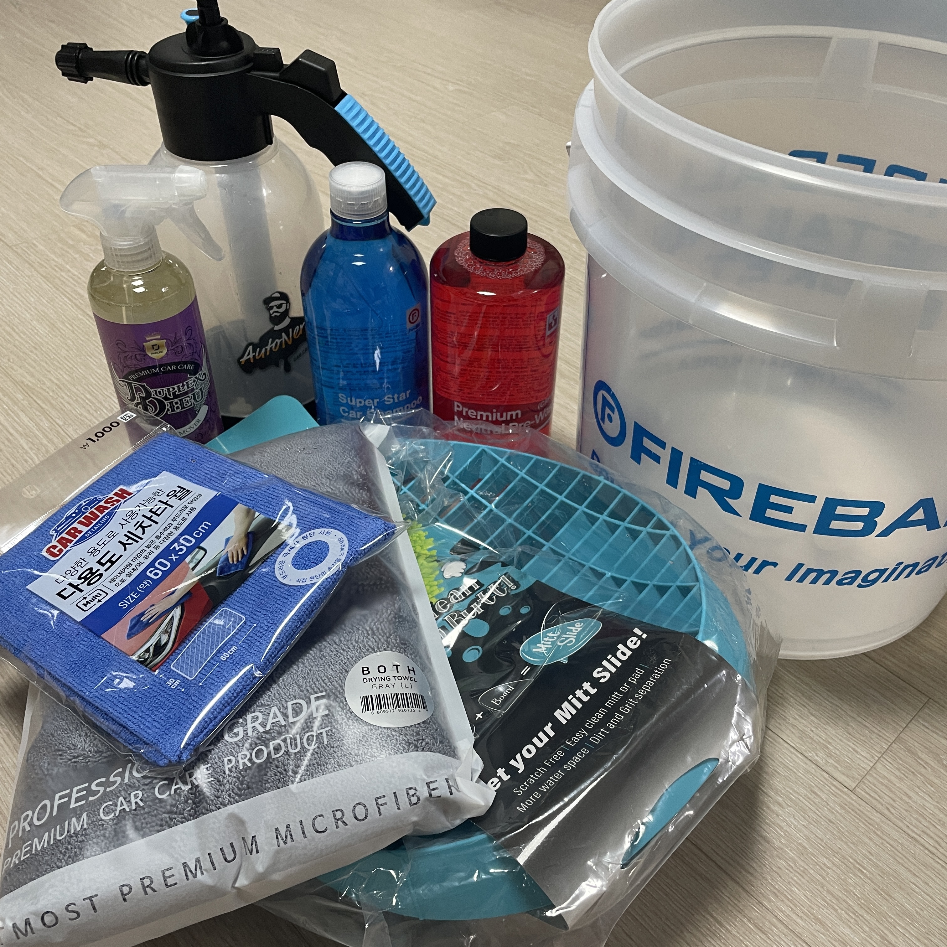 저의 경우 프리워시를 위한 압축분무기, 카 샴푸, 프리워시제, 철분제거제, 버킷, 미트슬라이드를 구매했습니다.