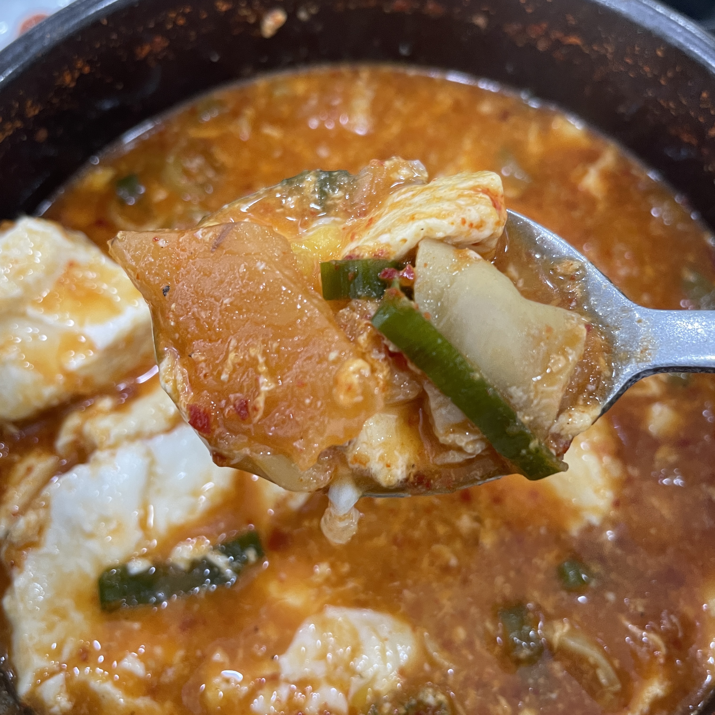 일반 마트에서 판매하는 순두부가 아니라 1층에서 직접 제조한 순두부를 사용해서 순두부의 모양이 이쁘지는 않습니다.