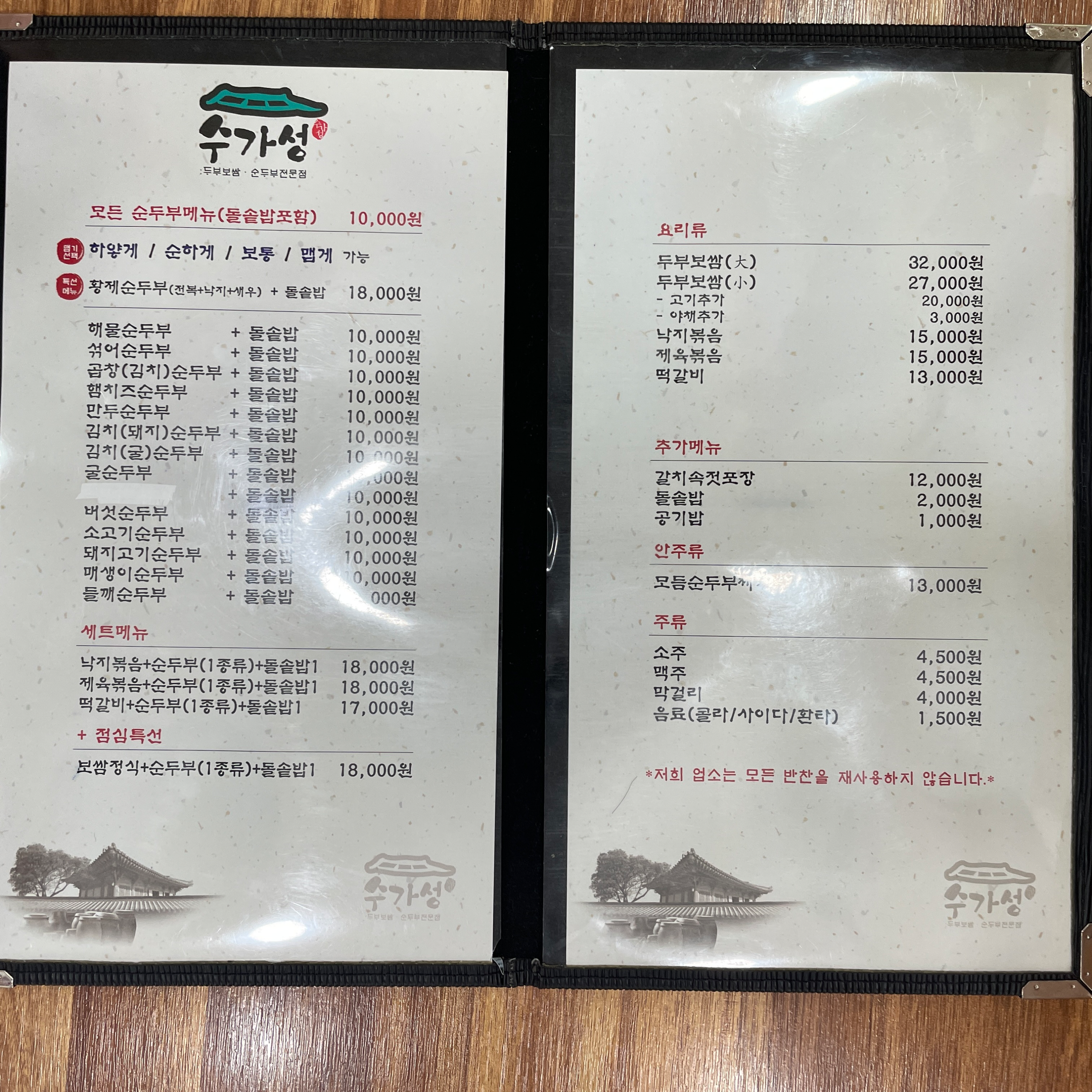 모든 순두부 메뉴가 1만원입니다.