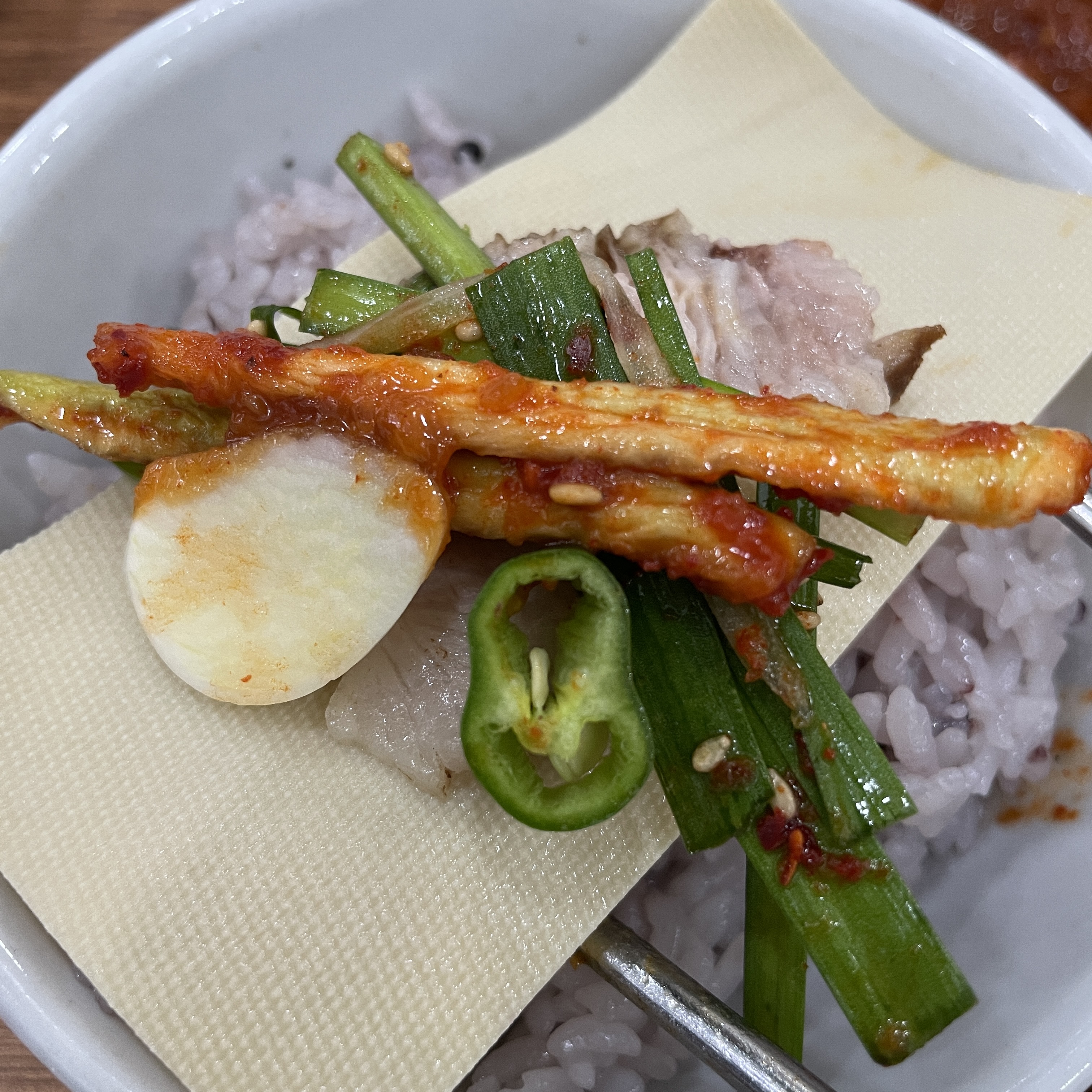 한방향이 가득한 보쌈에 무말랭이, 부추무침, 마늘, 고추와 쌈장 조합은 넘사입니다.
