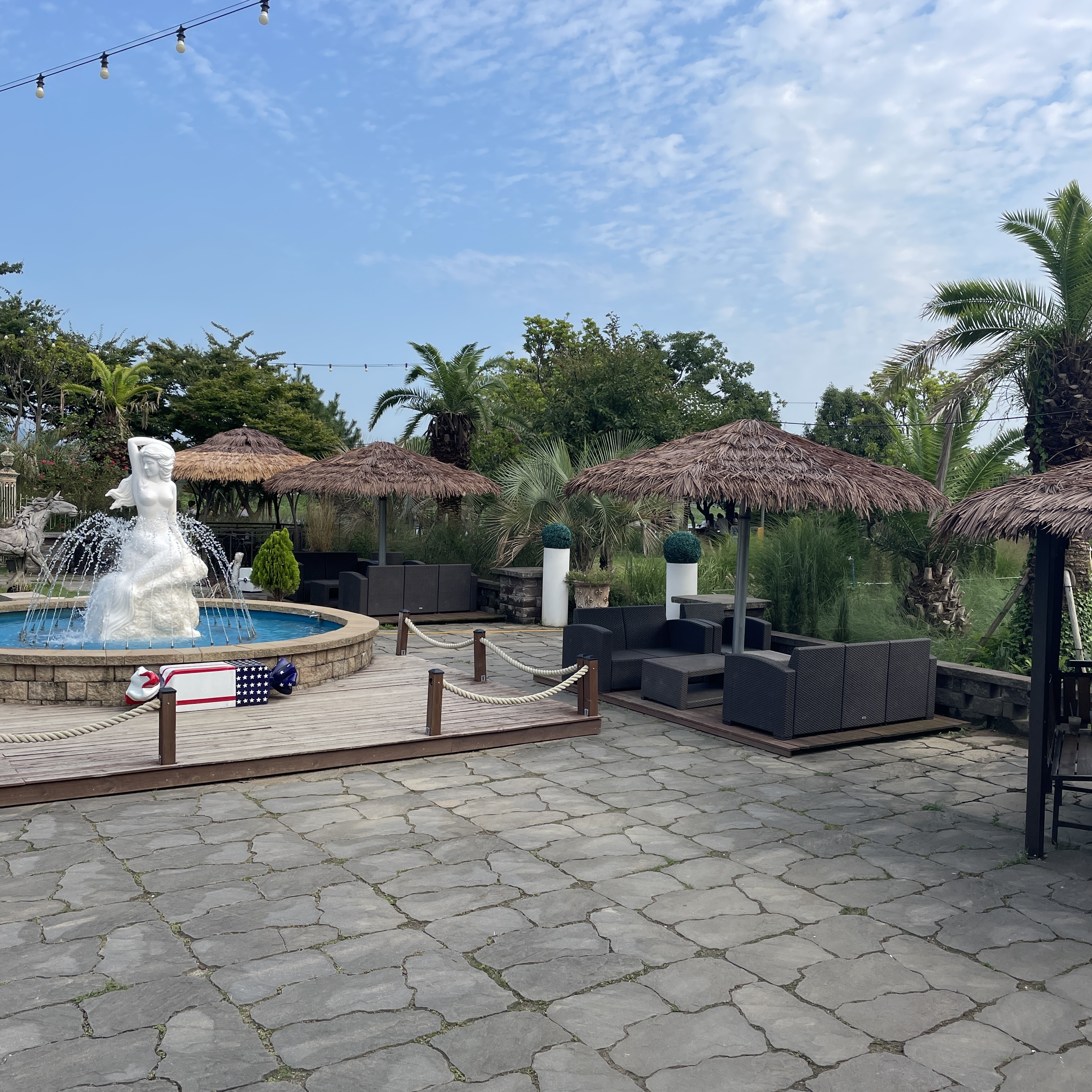 나오자마자 보이는 분수와 차양막이 마치 괌에 와 있는 느낌을 줍니다.