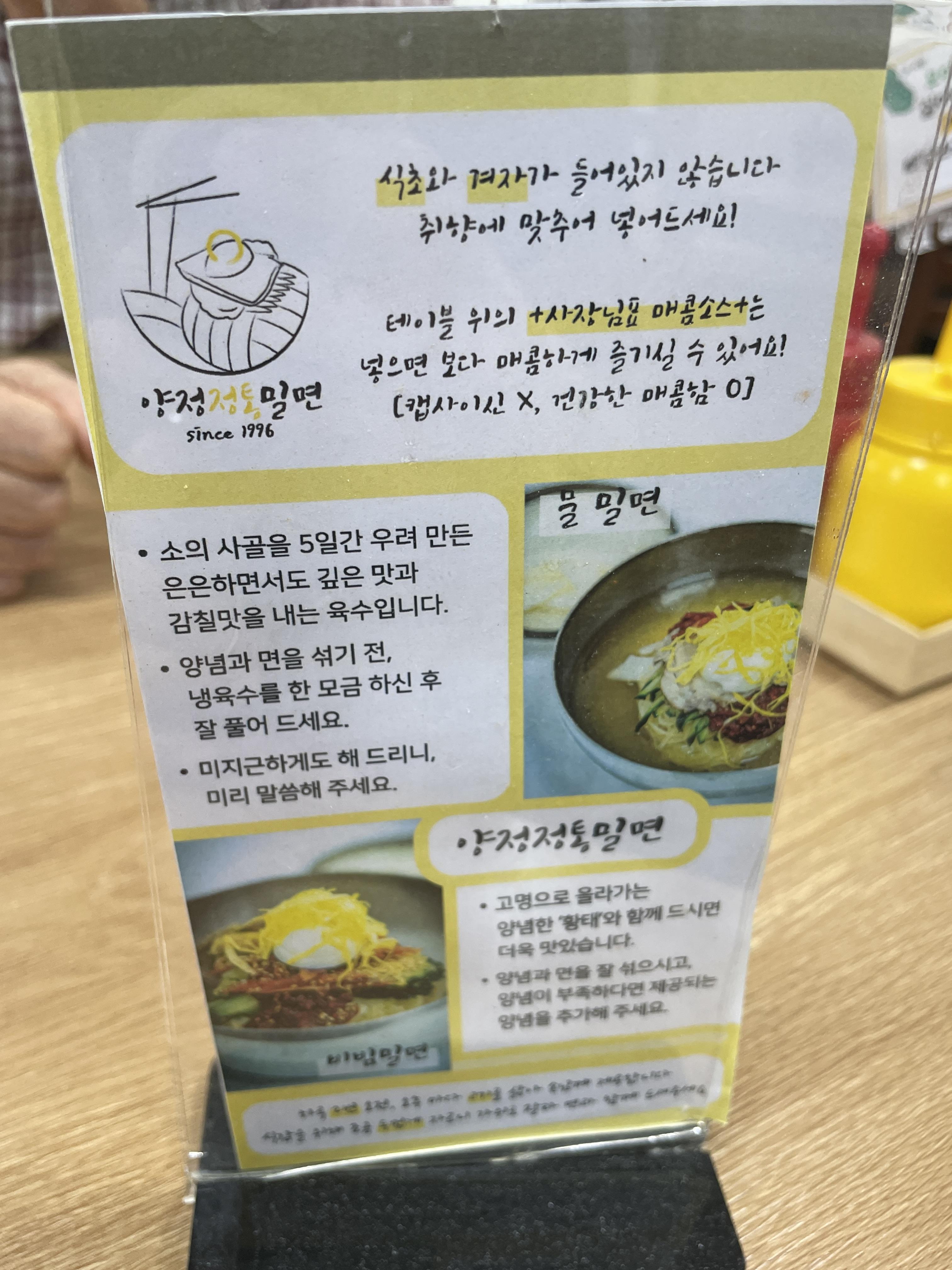 양정정통밀면을 즐기는 방법이 간략히 적혀 있네요.