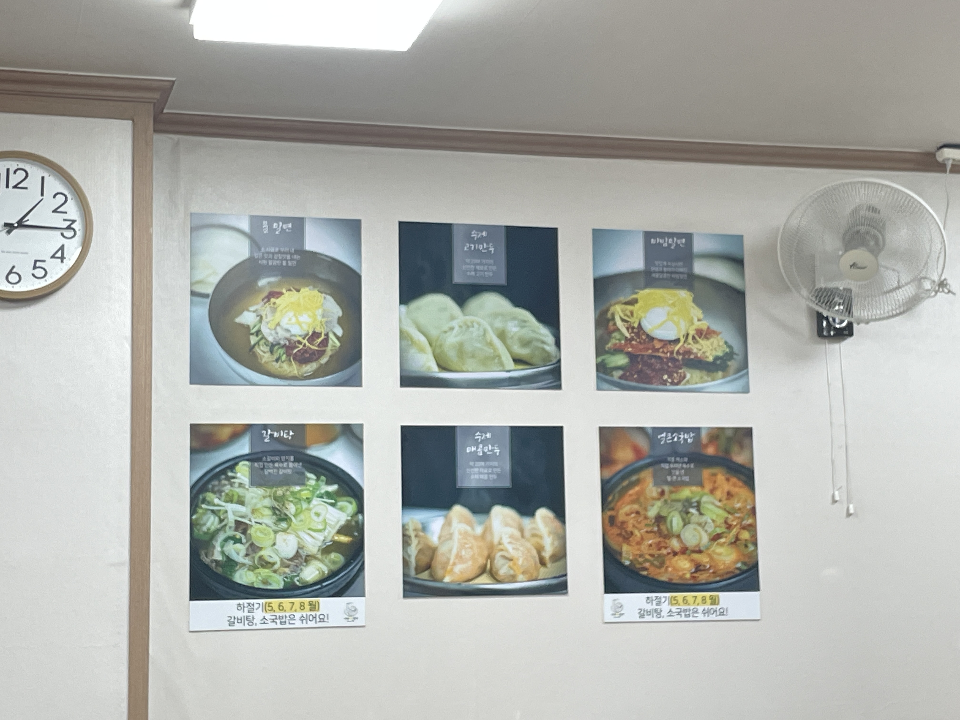 밀면과 만두, 갈비탕, 국밥이 사진으로 걸려 있네요.