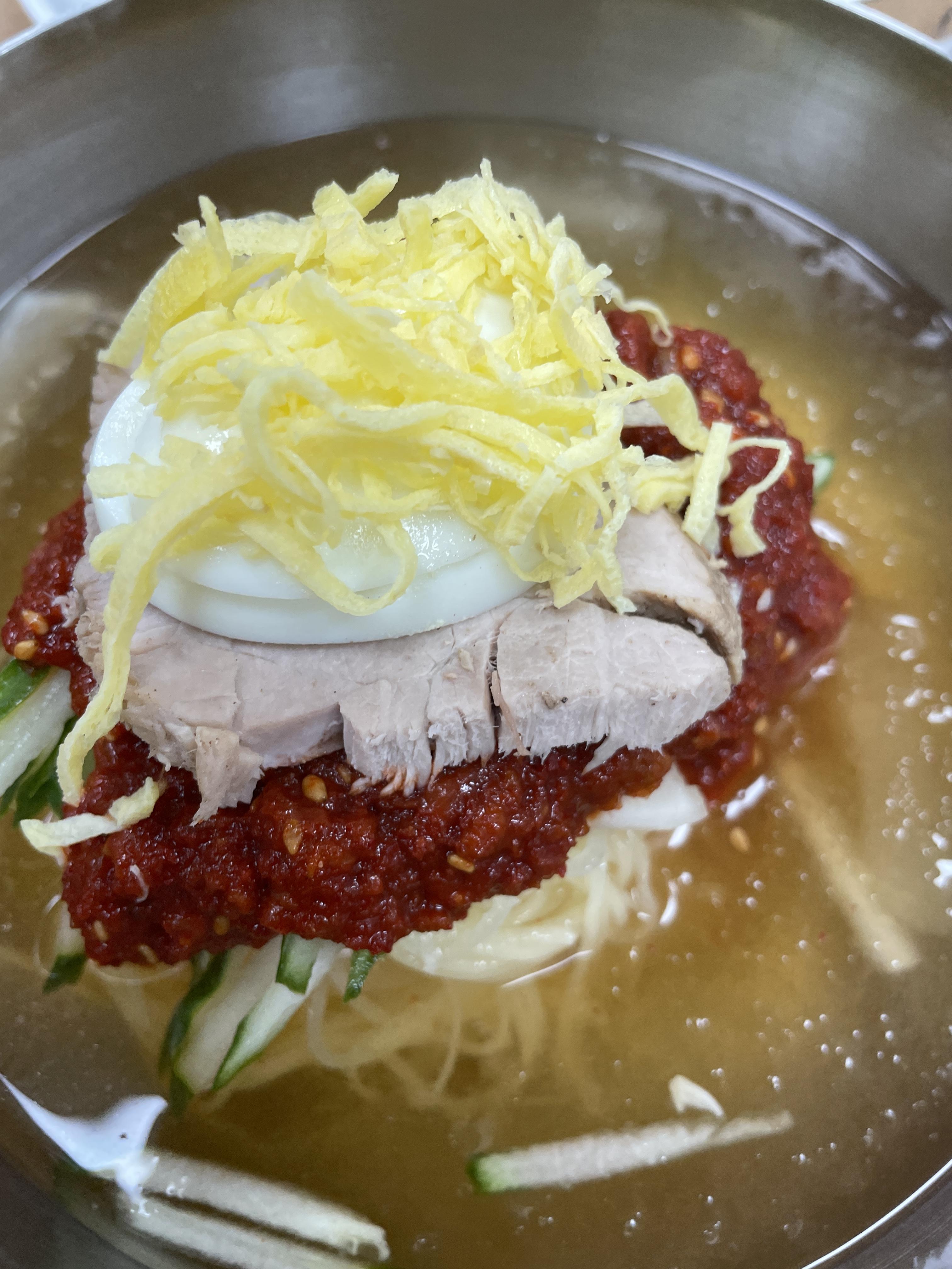 밀면 계란은 국물에 퍼지지 않도록 먼저 먹어줍니다.
