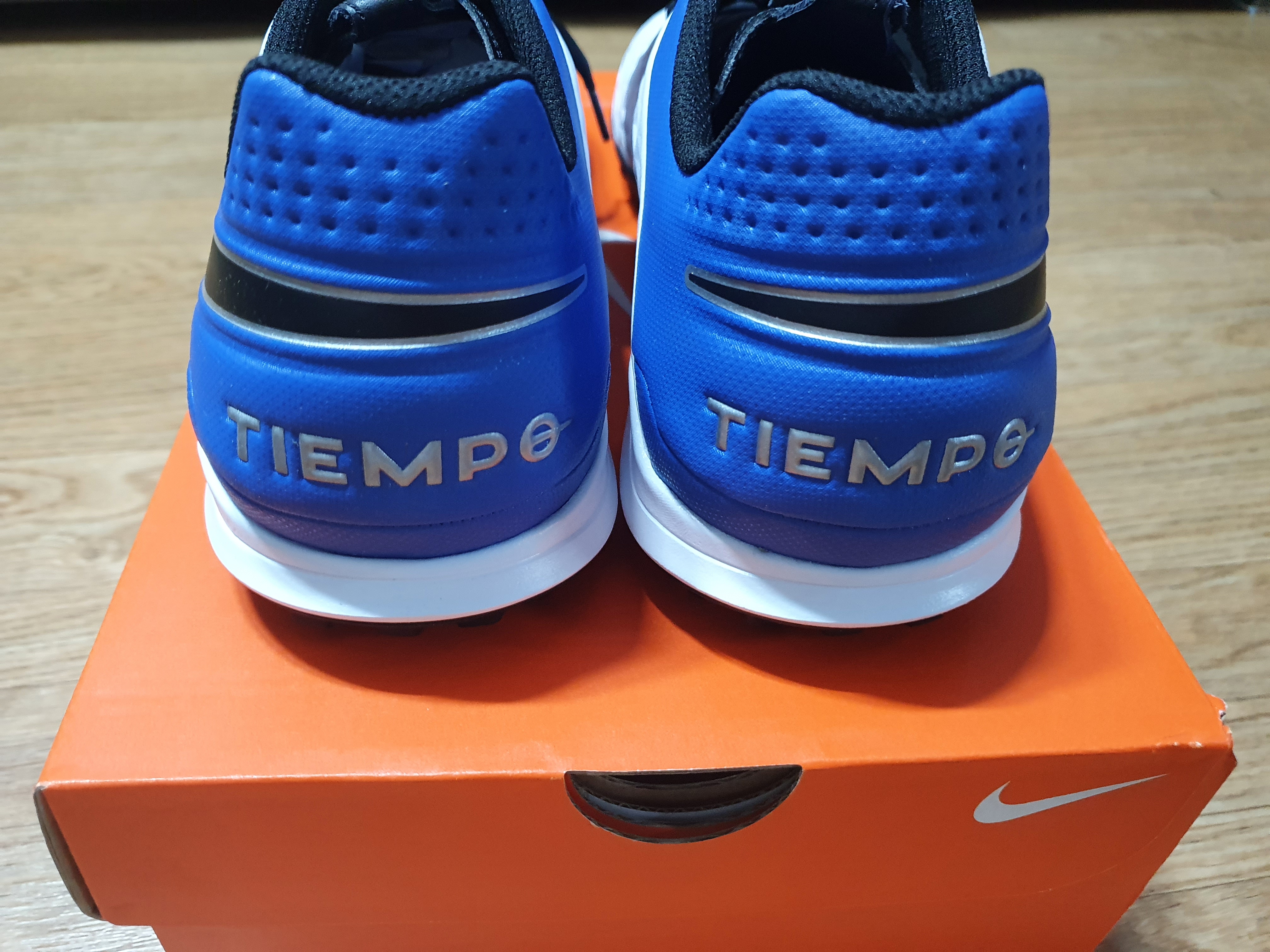 신발 내부의 바닥 부분은 파란색 바탕에 스우시와 함께 티엠포 로고가 있습니다.
