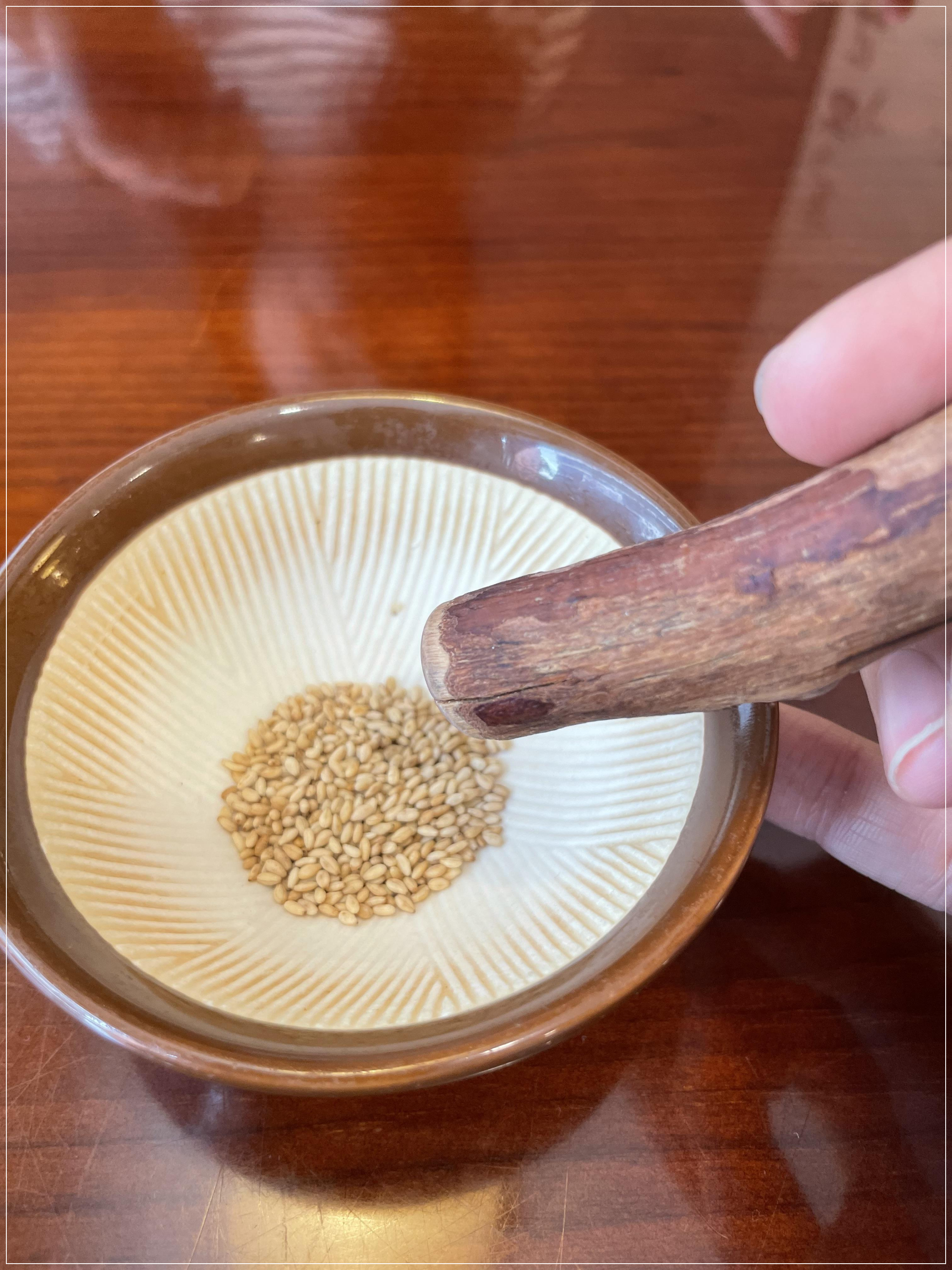 히레카츠는 소스에 참깨를 함께 넣어 먹는데, 사진처럼 갈아서 넣을 수 있도록 나무 막대가 준비되어 있습니다.