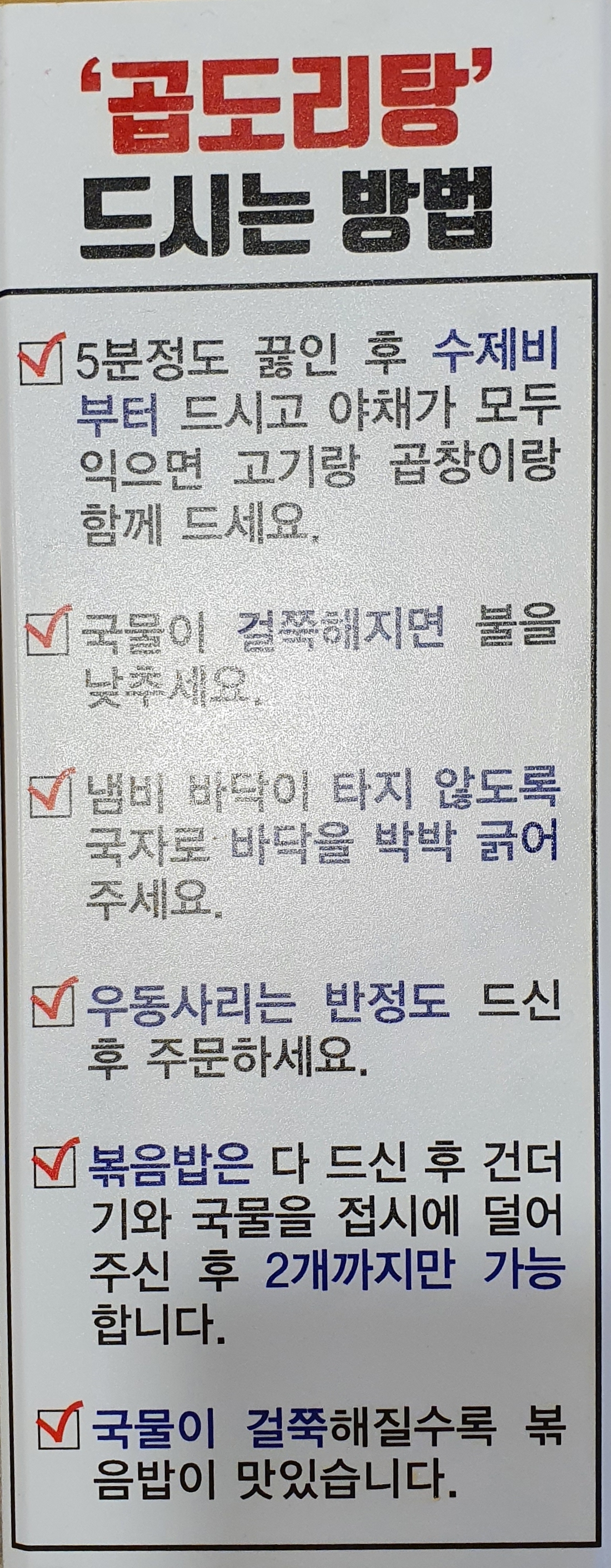 ‼️ 수제비 - 닭, 곱창 - 우동사리 - 볶음밥 순서 ‼️
