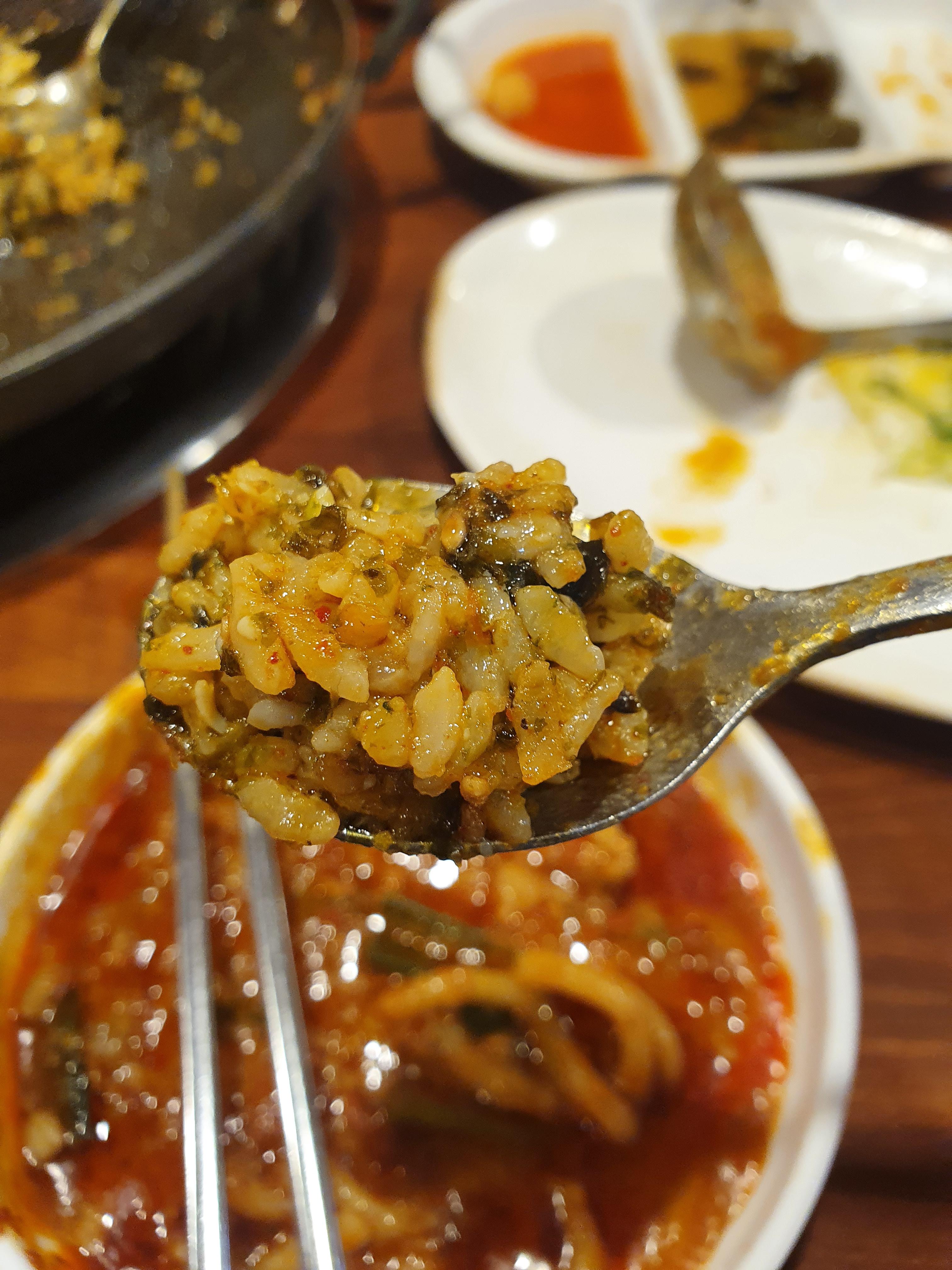 그리고 닭과 곱창이 익을 동안 수제비를 드시고 닭과 곱창을 드시면 됩니다. 먹다 보면 양이 조금 줄었다 싶을 때가 있으세요. 그때 바로 직원분에게 우동사리를 주문하여 조금 더 끓여줍니다. 충분히 익힌 우동사리와 닭, 곱창을 다 드신 후에는 국물과 건더기를 다 앞접시에 담은 후 볶음밥 주문!