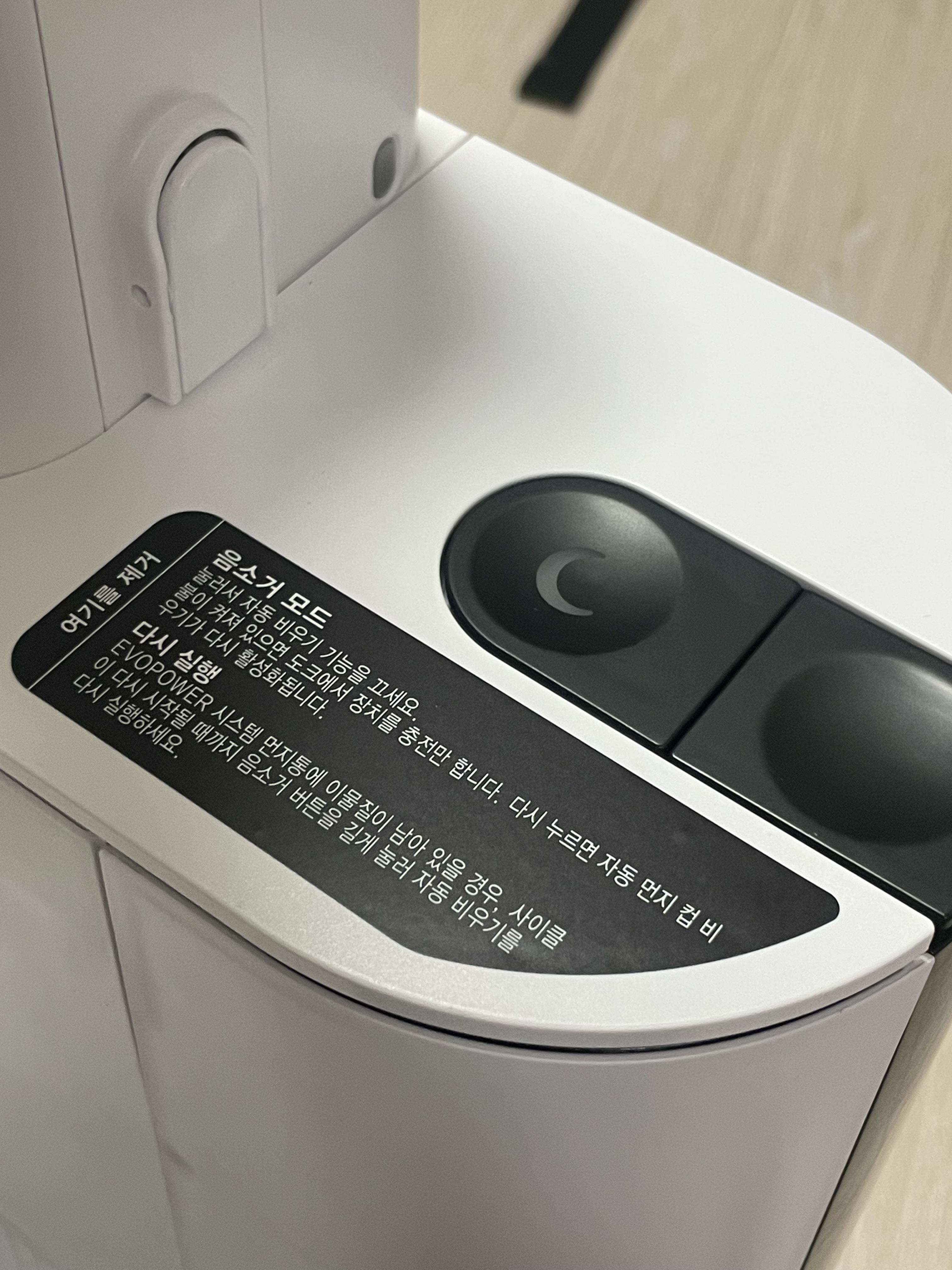 사진에서 보이는 달 버튼을 누르면 음소거 모드가 되기 때문에 청소기가 스테이션에 장착되었을 때 자동으로 먼지를 비워주는 시스템이 중지됩니다.