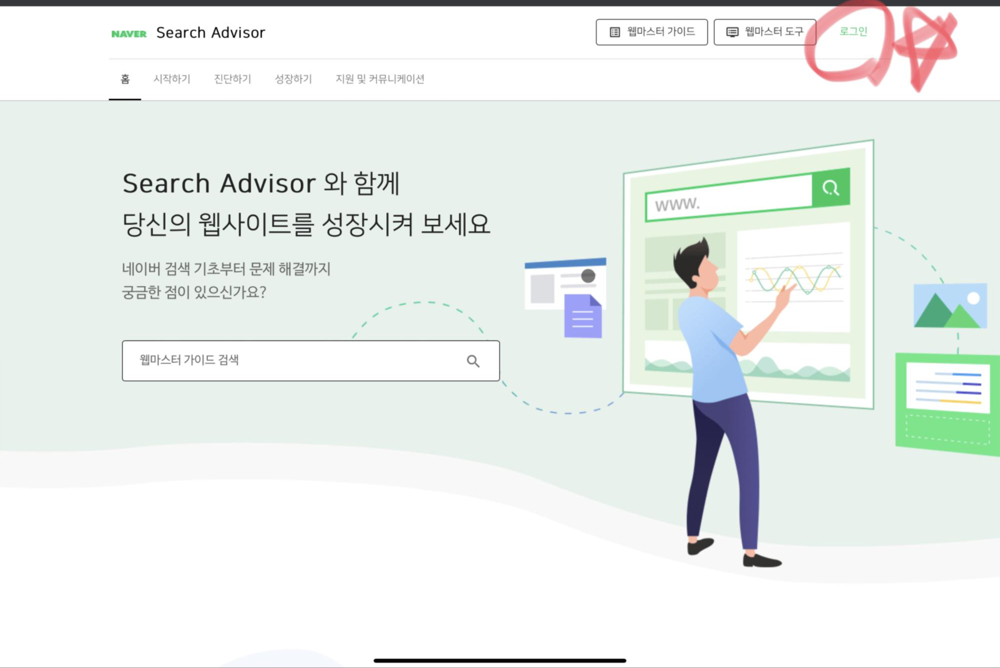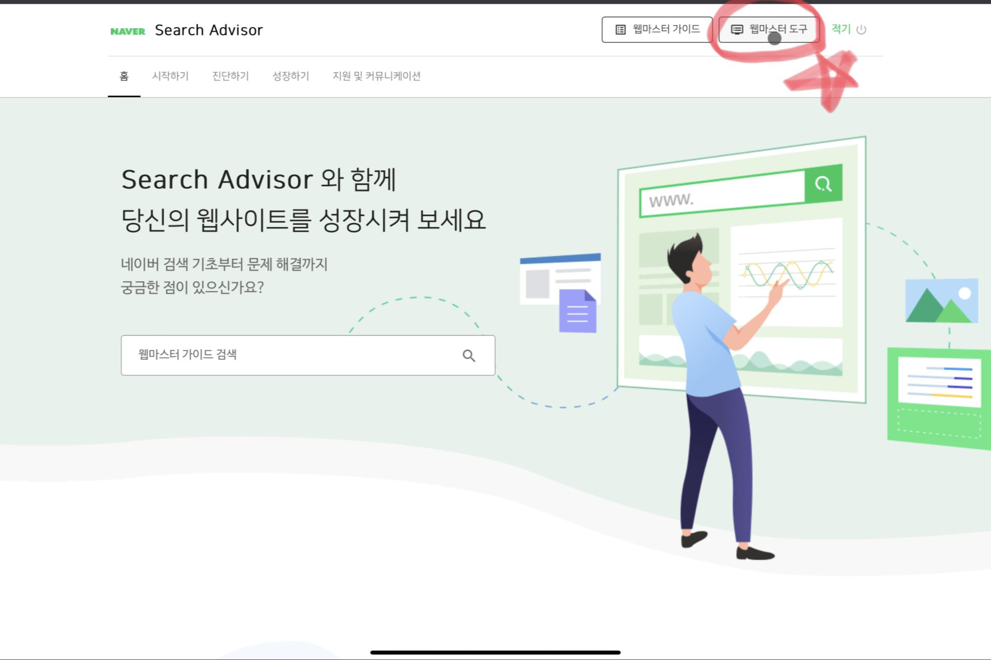 로그인을 다 마치셨으면 우측 상단에 웹마스터 도구 클릭!