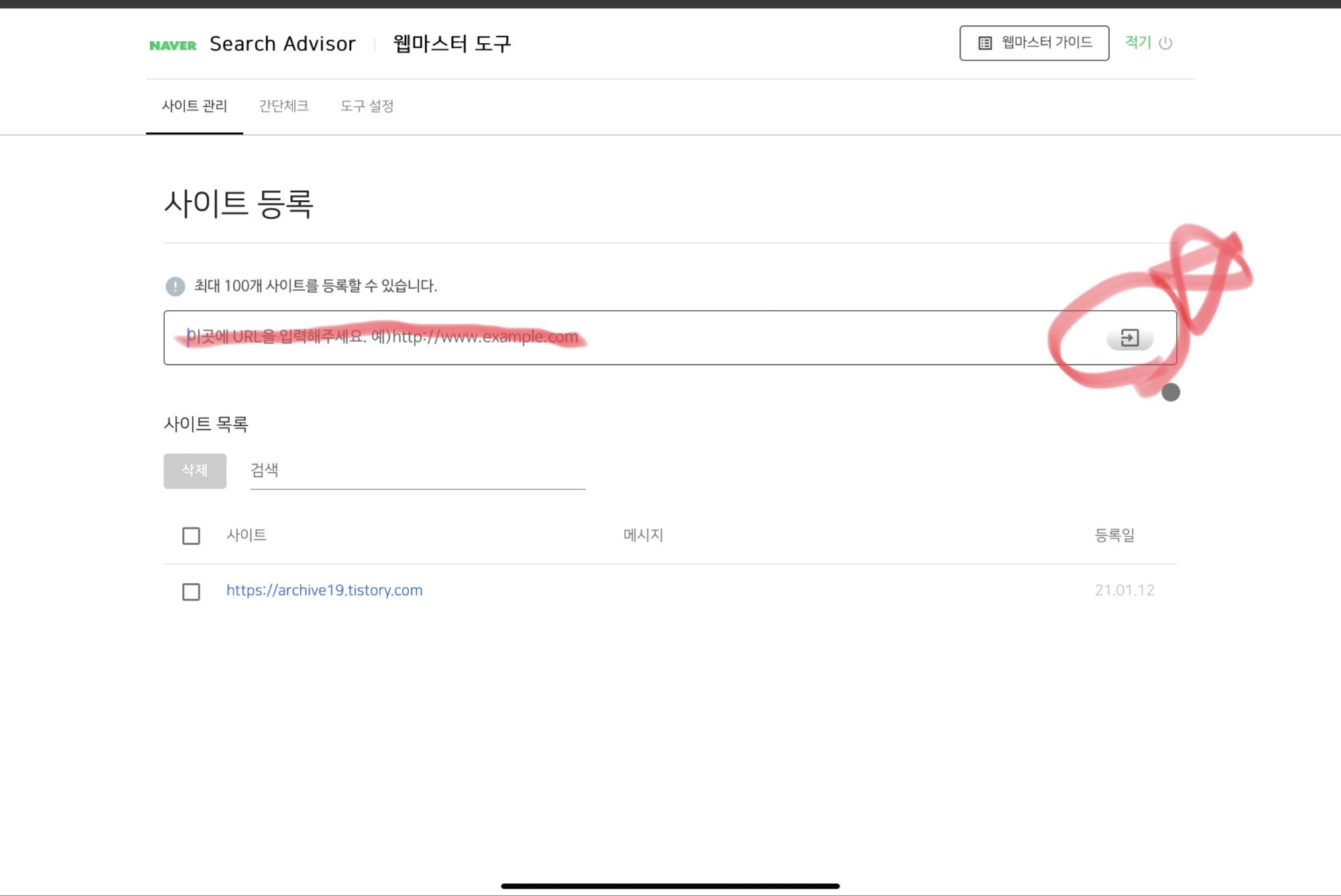 사이트 등록 하부 빨간 줄 부분에 자신의 블로그 메인 페이지 주소를 입력해주시고 오른쪽 로그인 버튼 클릭!