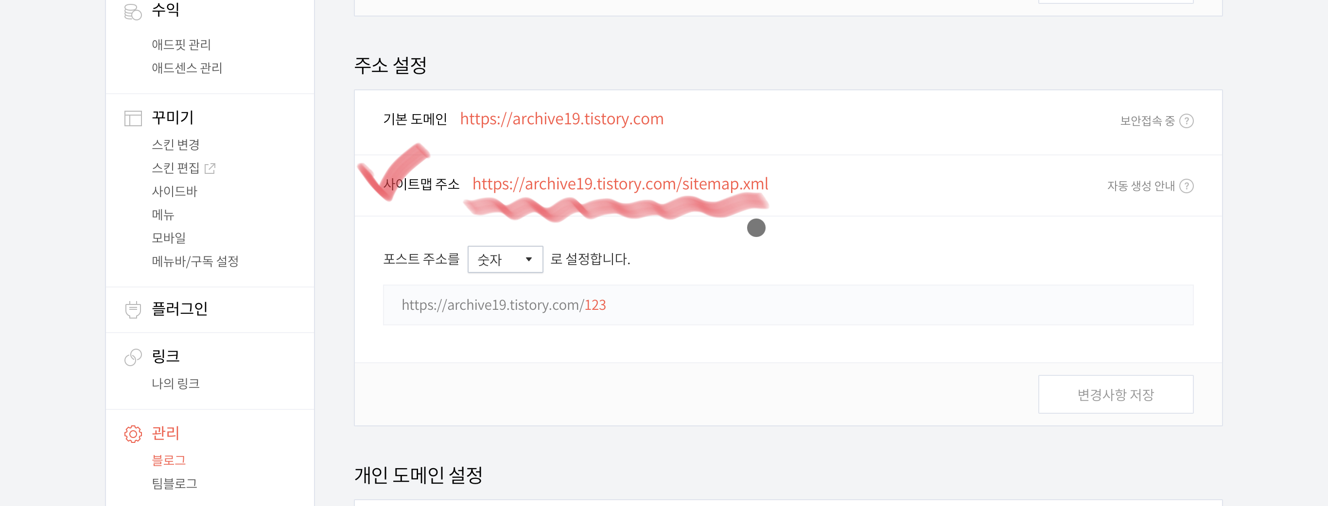 마지막으로 잘 등록되었는지 확인하시려면 자신의 티스토리 홈페이지 좌측 아랫부분 블로그를 클릭하시면 다음 사진과 같이 사이트맵이 등록되어 있습니다~