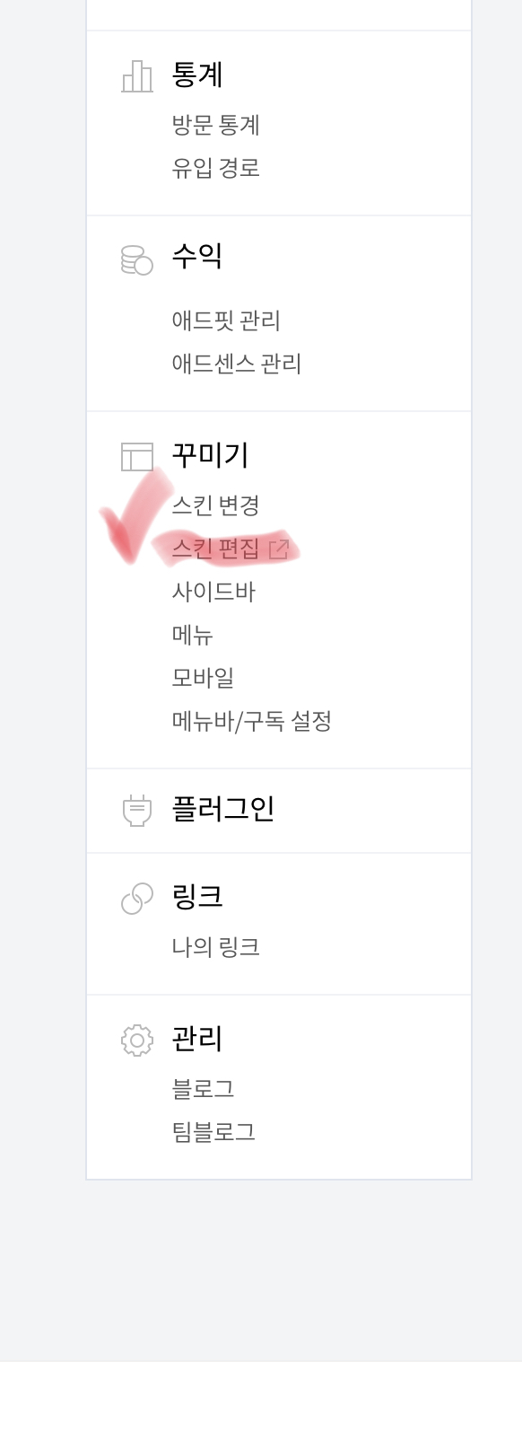 티스토리 관리 페이지 좌측 하부에 있는 스킨 편집으로 들어와 줍니다~