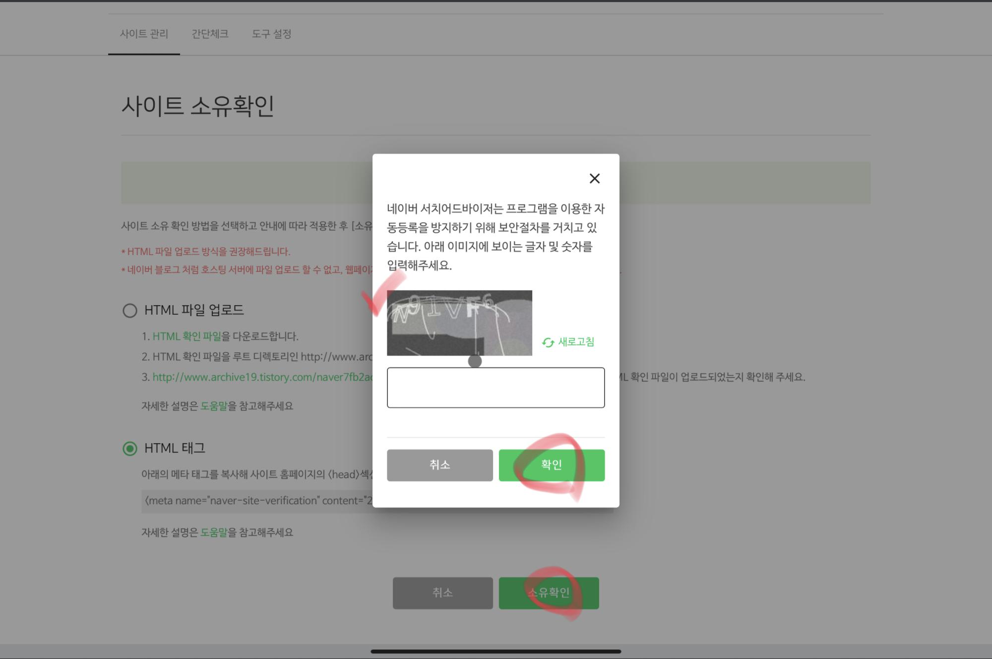 저희는 HTML 태그 방법을 사용하여 본인의 사이트임을 확인해줄 거예요~