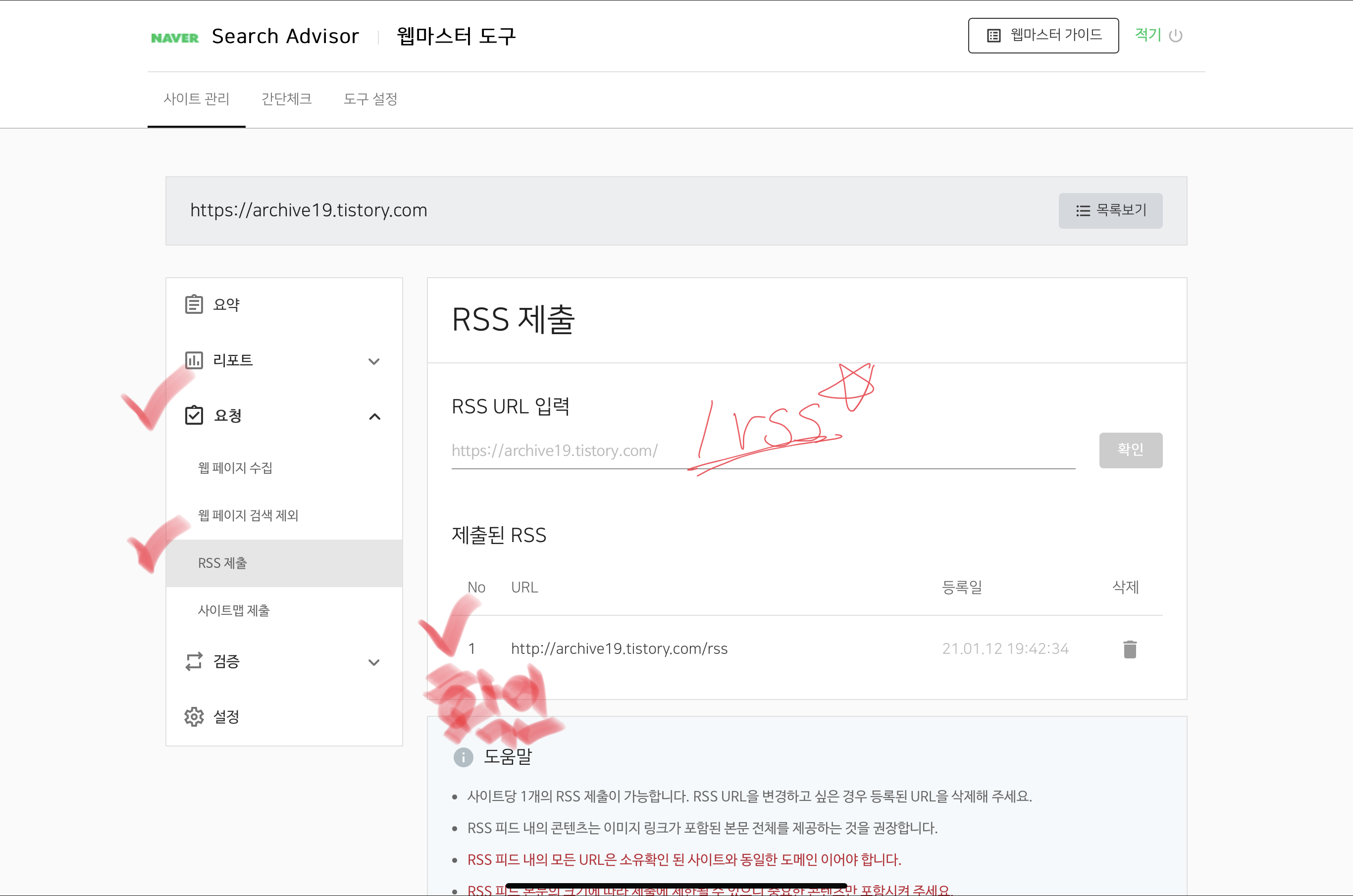 좌측 요청의 RSS 제출 클릭!