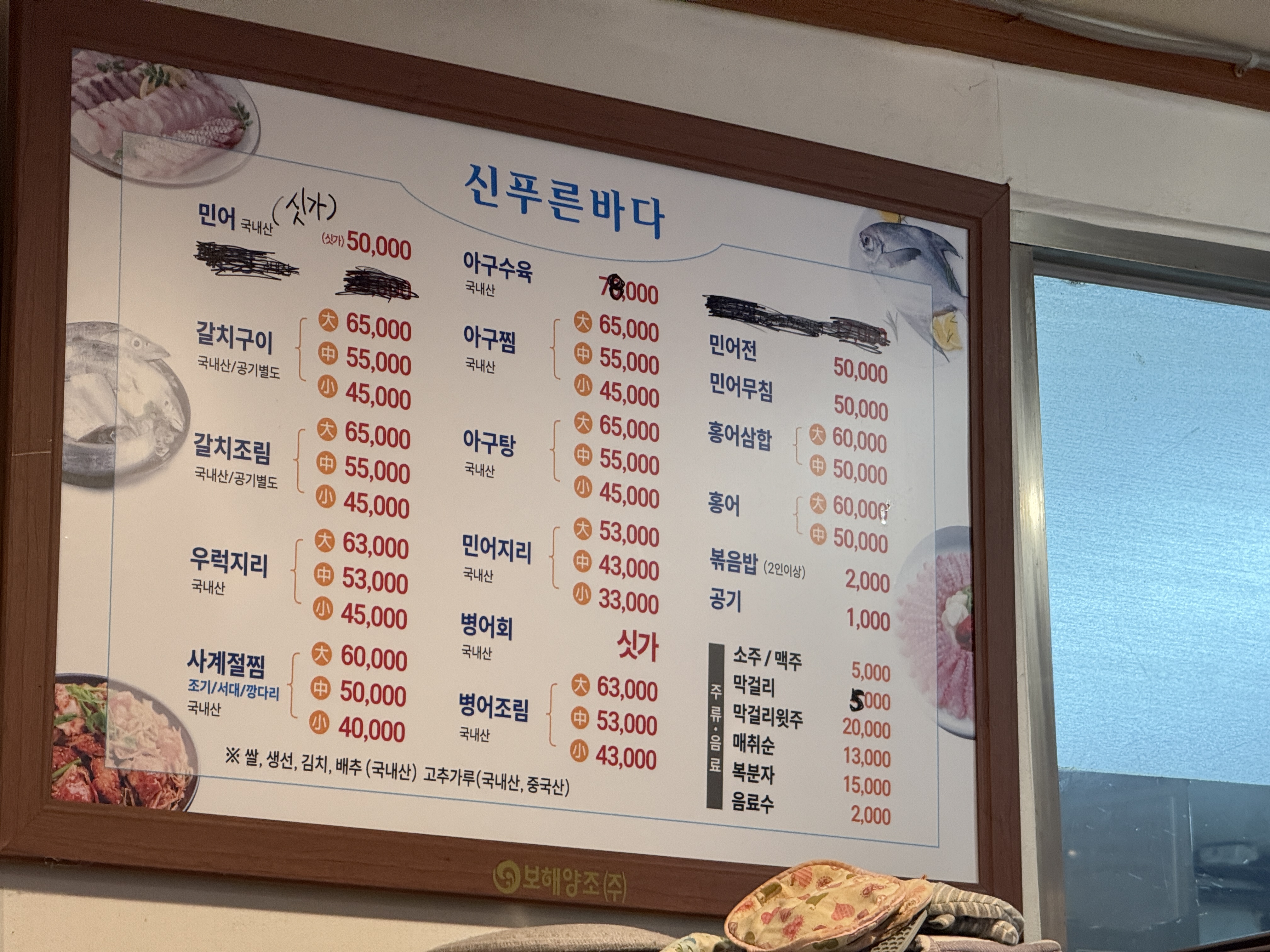 해산물 요리가 가득한 메뉴판입니다.