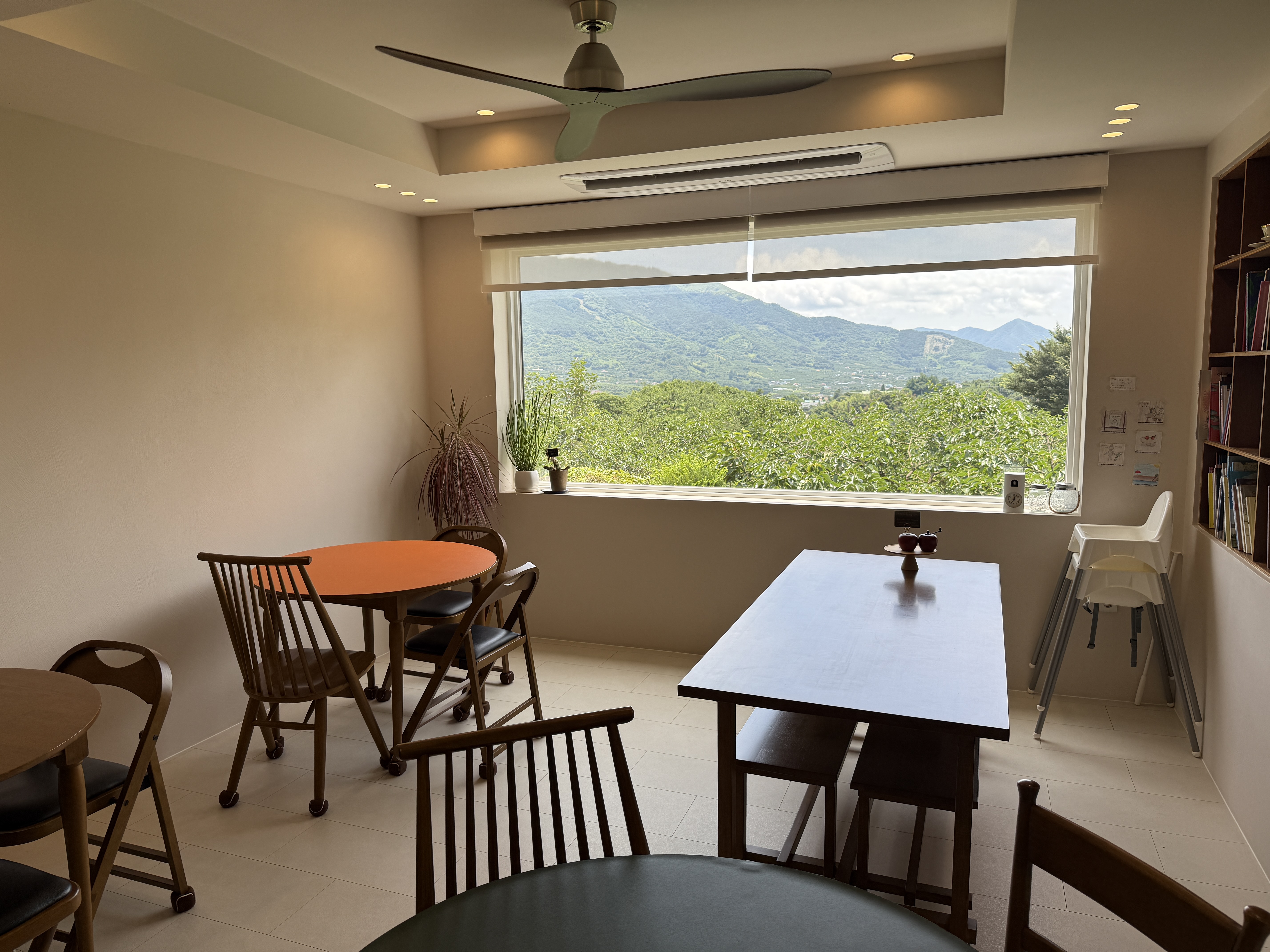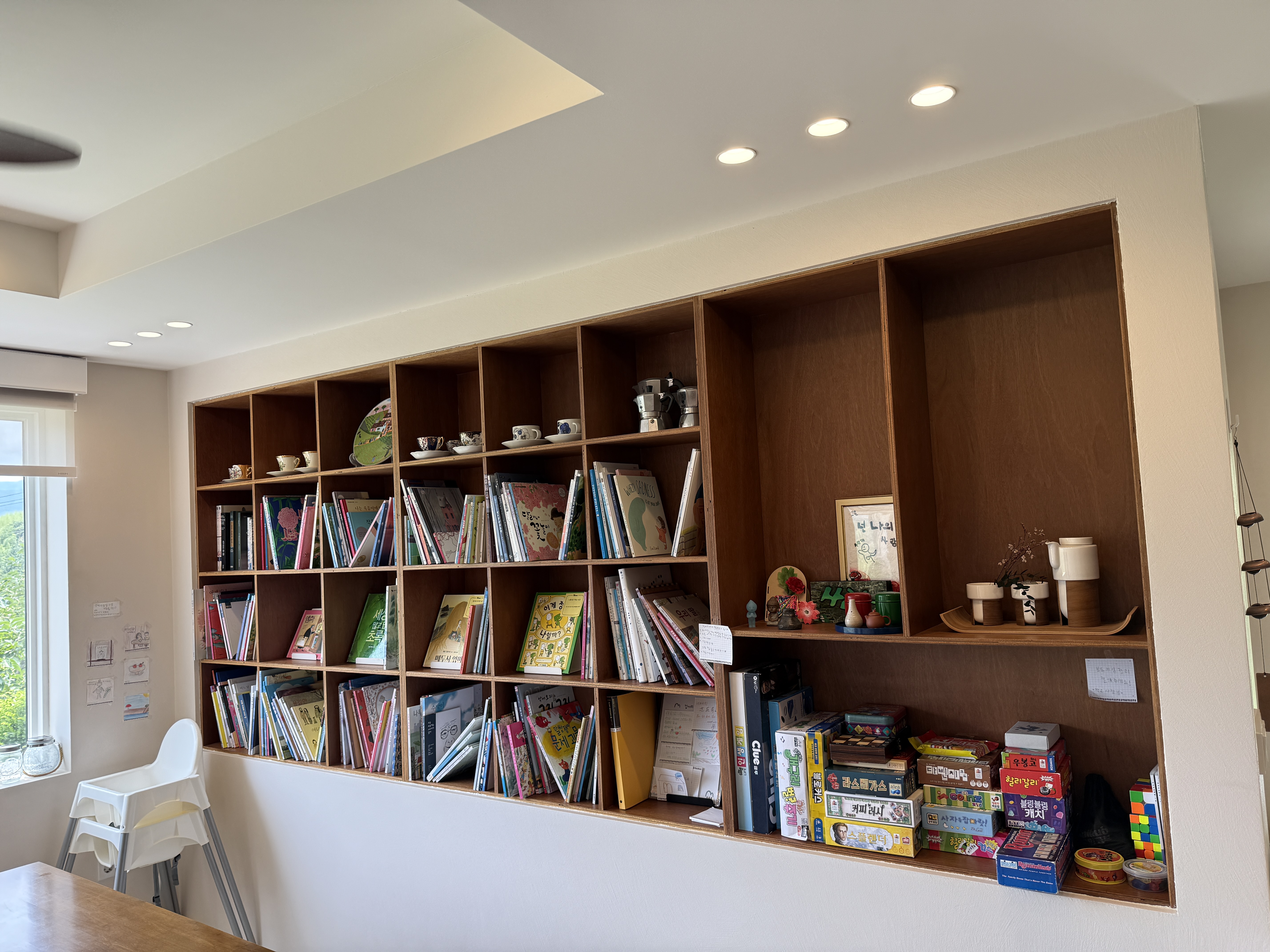 아주 큰 통창과 아이가 사용하고 있는 책장이 있습니다.