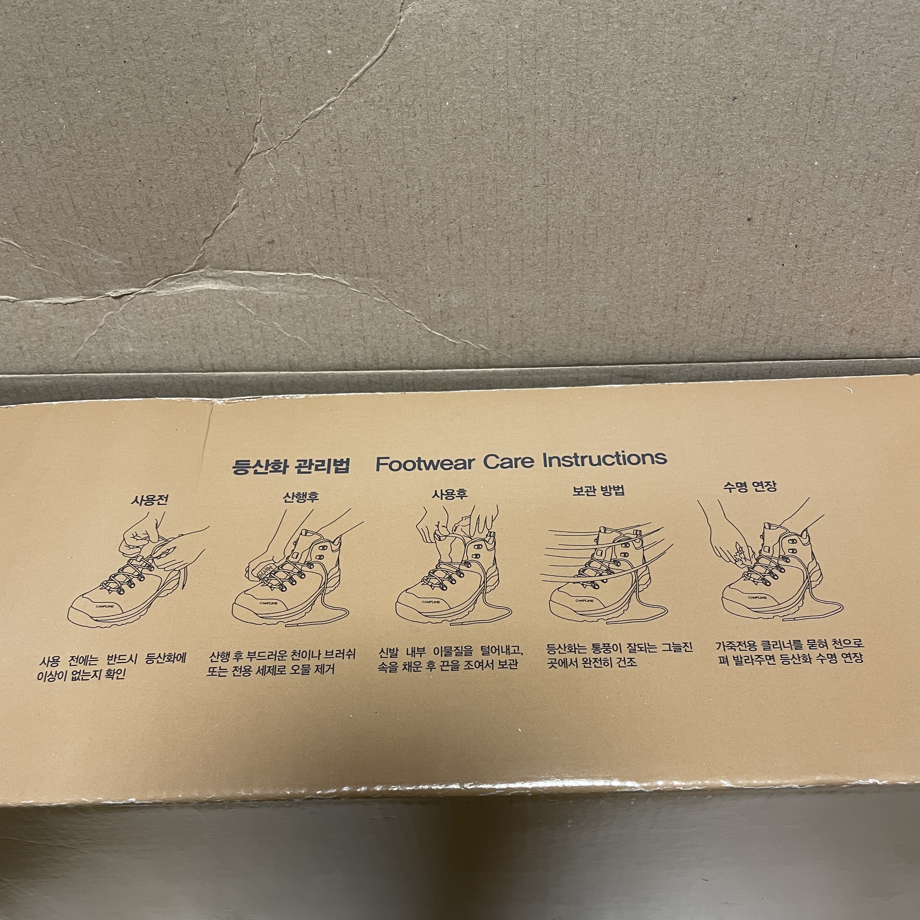 1차 개봉 시 등산화의 사용법과 보관법이 상세히 적혀 있어요!